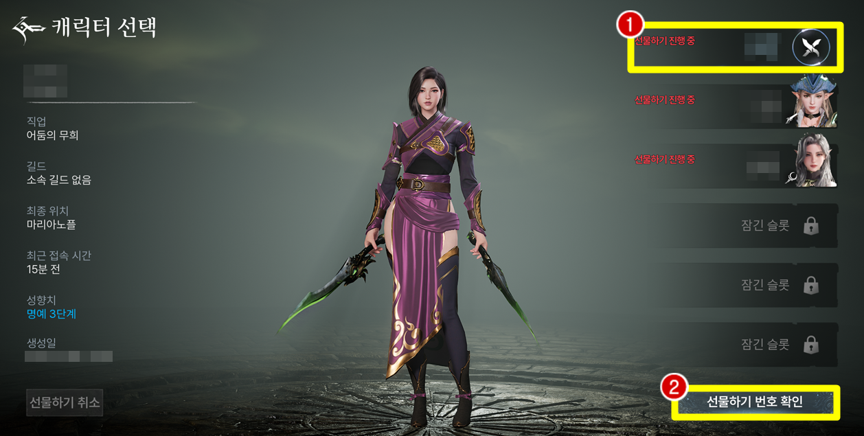 - 캐릭터 선물받기 시 계정 내 모든 서버에 캐릭터 생성 이력이 없는 새로운 계정으로만 캐릭터 선물받기가 가능합니다.