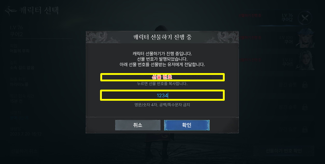 다만, 이미 다른 계정에서 캐릭터 선물번호를 입력한 상태에서는 캐릭터 선물하기가 취소되지 않습니다.