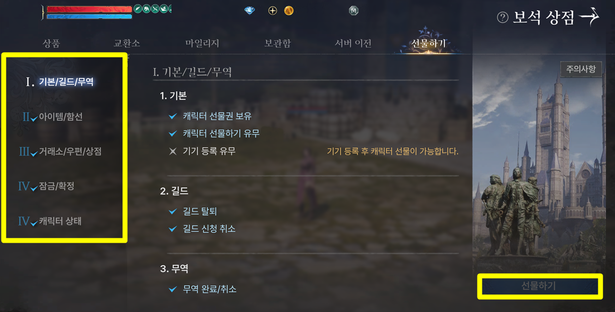 - 보석 상점 보관함에 수령하지 않은 상품이 있는 경우 캐릭터 선물하기가 진행되지 않습니다.