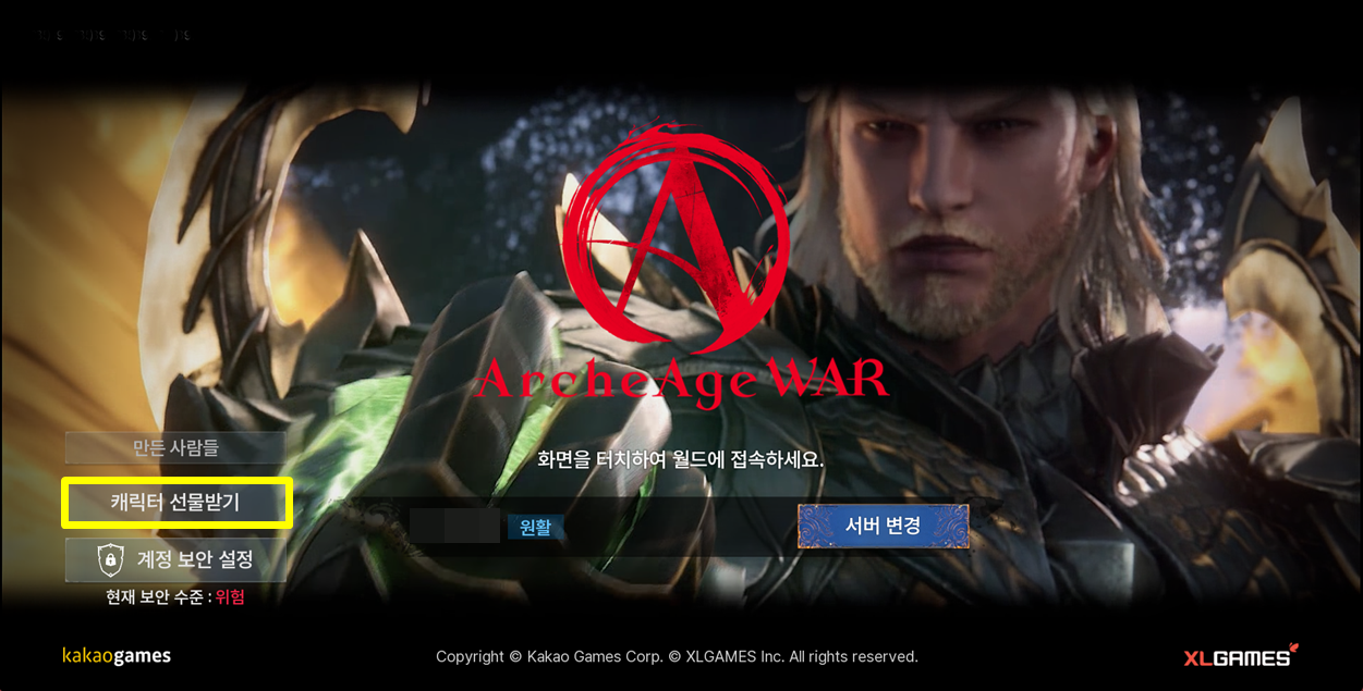 - 모든 서버에 캐릭터 생성 이력이 없는 계정으로 로그인 후 좌측 하단에 [캐릭터 선물받기] 버튼을 클릭합니다.