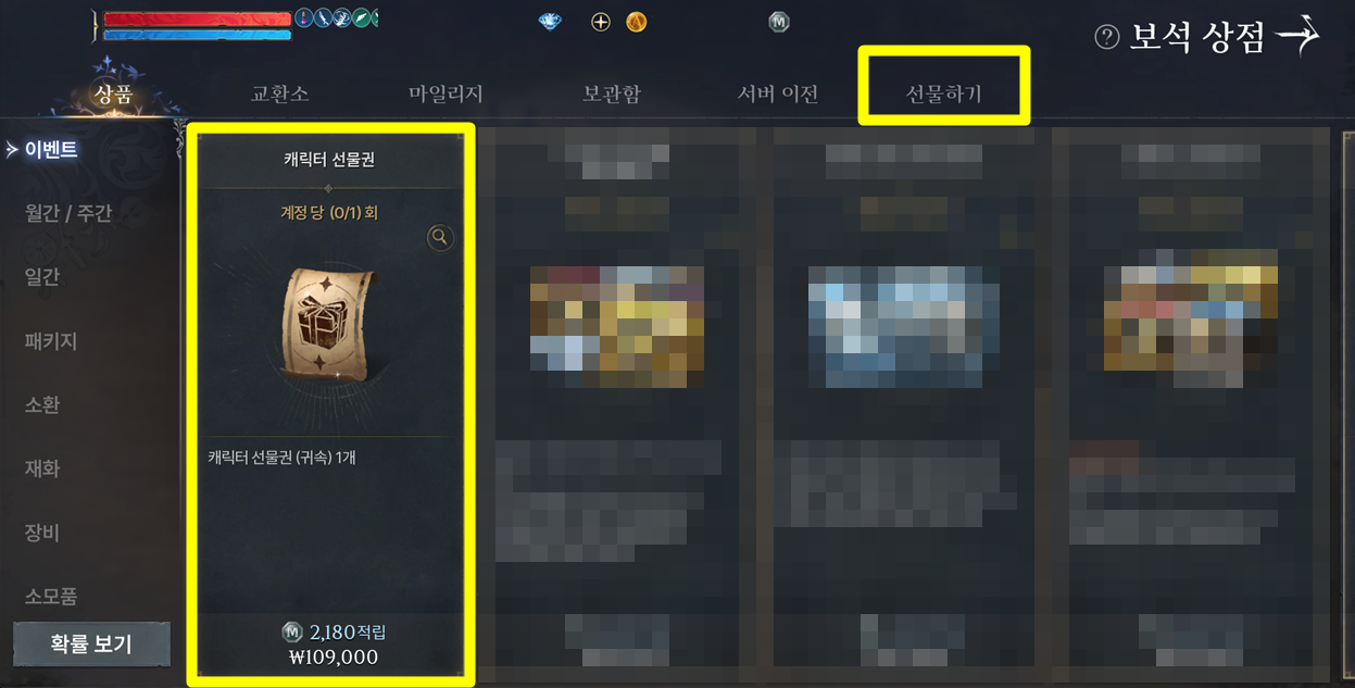 | 캐릭터 선물권 (귀속) | 계정당 1회 | KRW 109,000 | 60레벨 이상 캐릭터 |