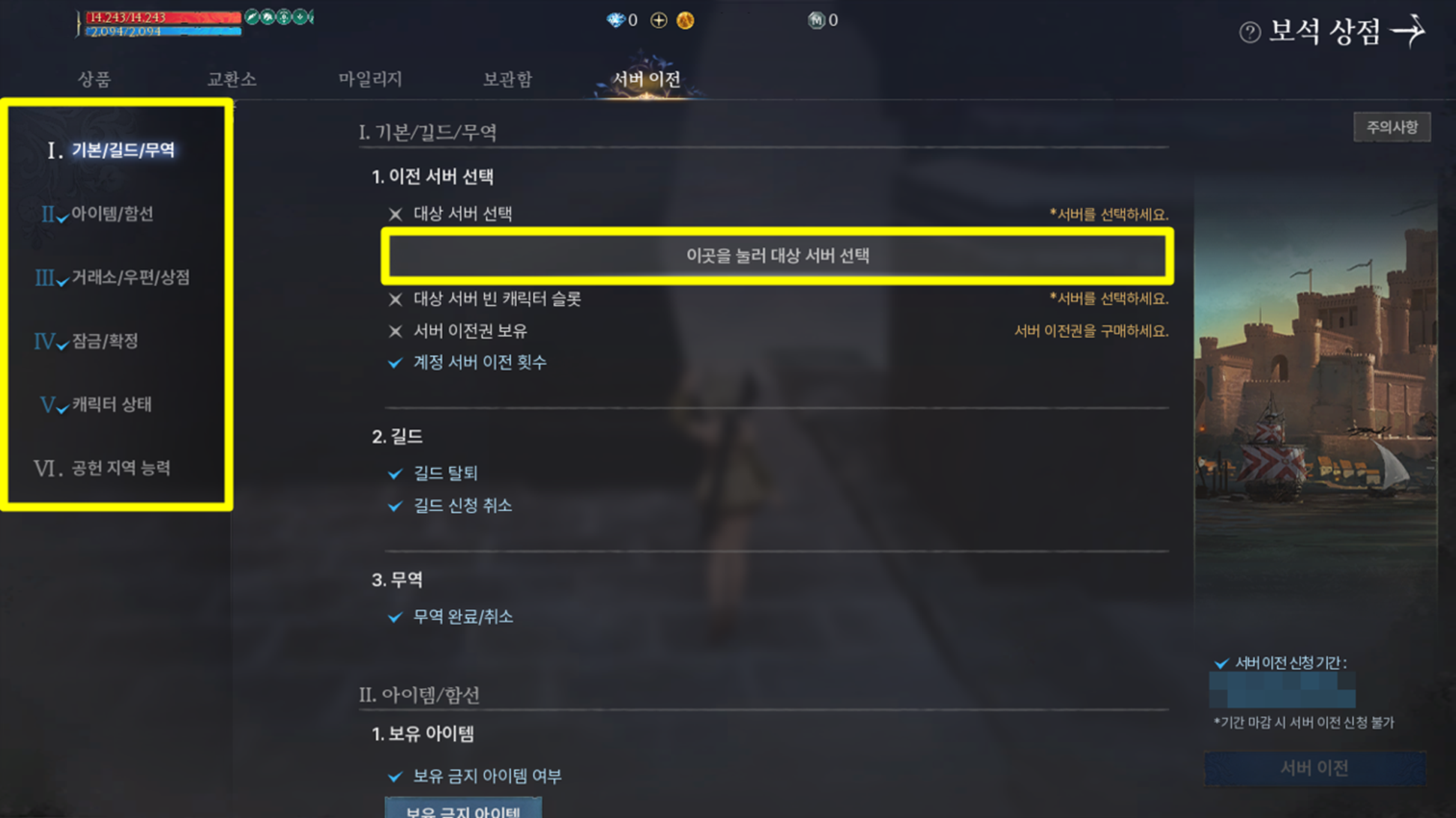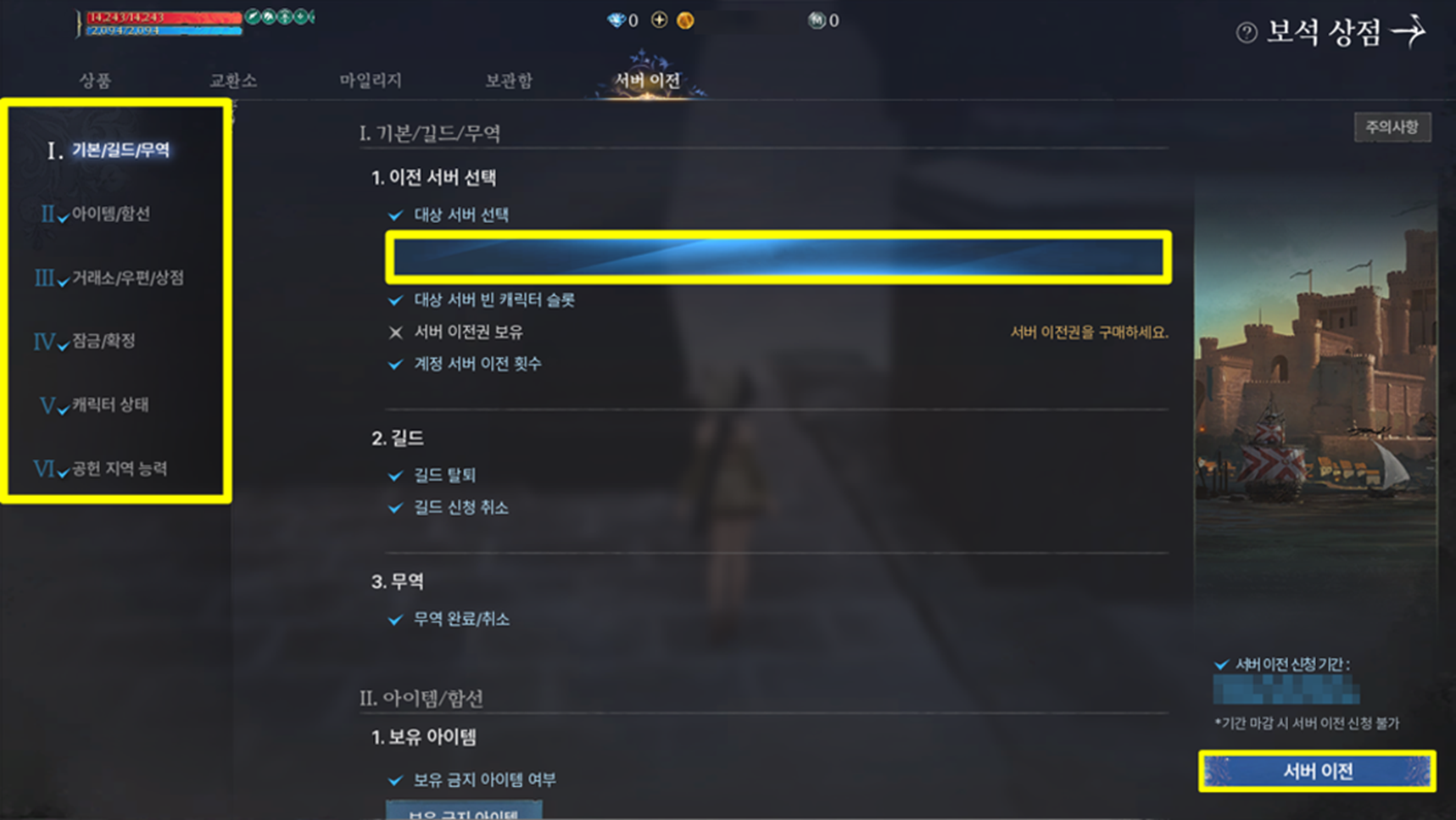 - 서버 이전권을 보유한 상태에서 보석 상점 내 [서버 이전] 탭으로 이동 시 서버 이전 조건을 확인할 수 있습니다.