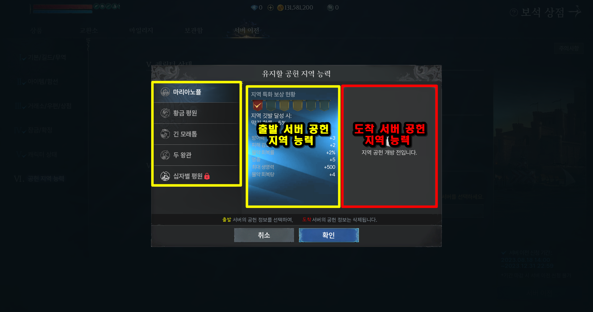 · 서버 이전 시 현재의 공헌 지역 능력을 유지하려면 왼쪽의 출발 서버를 선택해주세요.