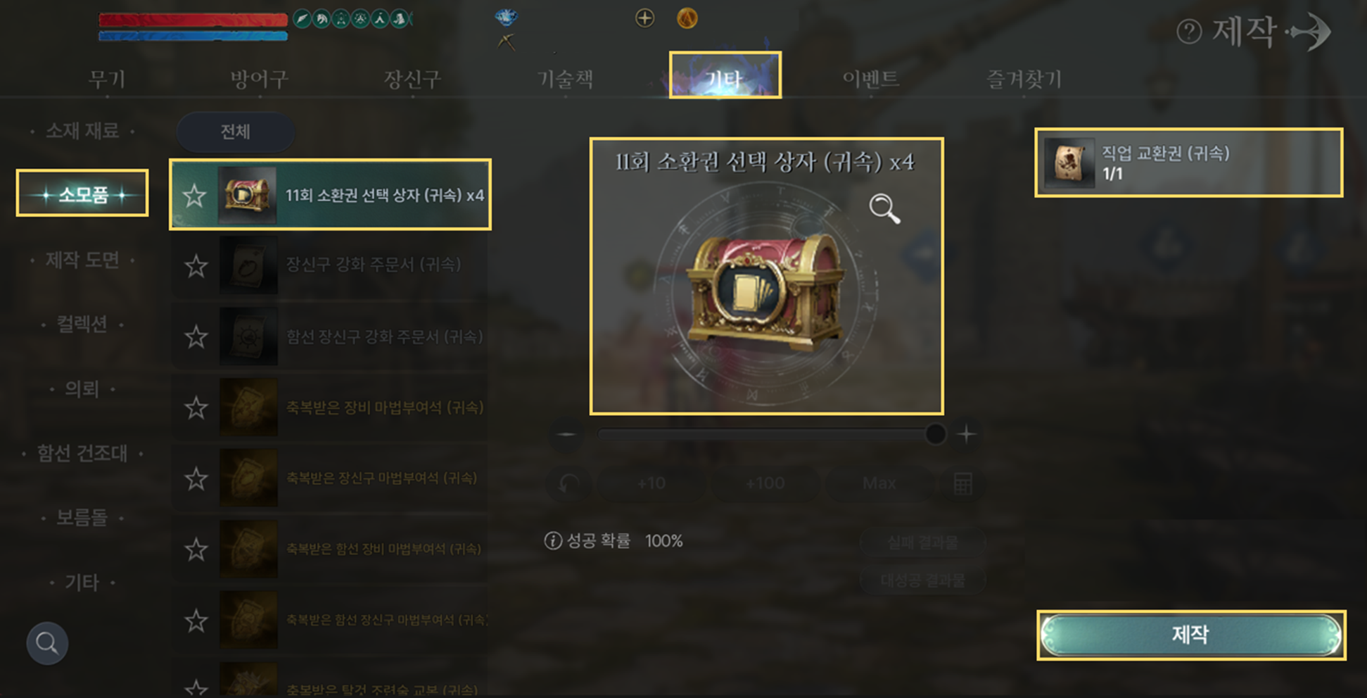 - 제작 : [메뉴 - 제작 - 기타 - 소모품] 탭에서 직업 교환권 (귀속) 1개를 재료로 11회 소환권 선택 상자 (귀속) 4개를 제작할 수 있습니다.
