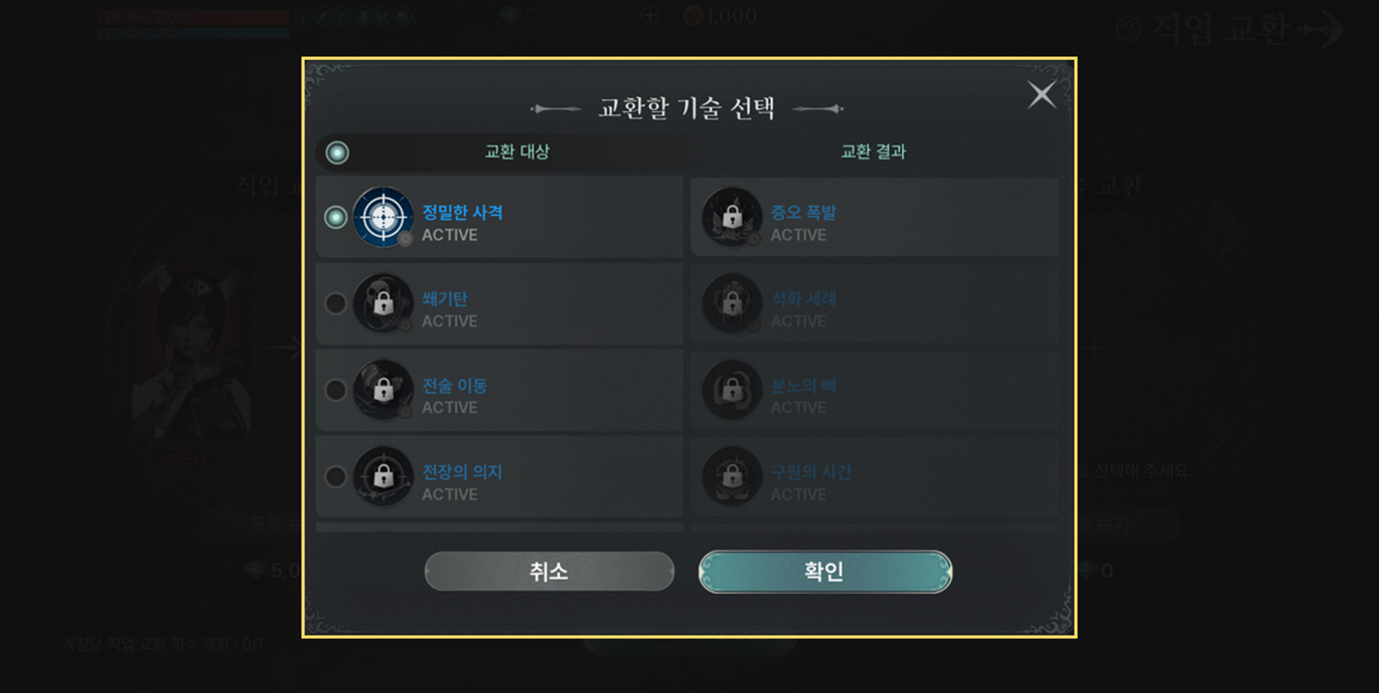 ⓘ 직업 교환 시 전설 직업은 오키드나, 바르아 중 하나를 선택하여 교환할 수 있습니다.