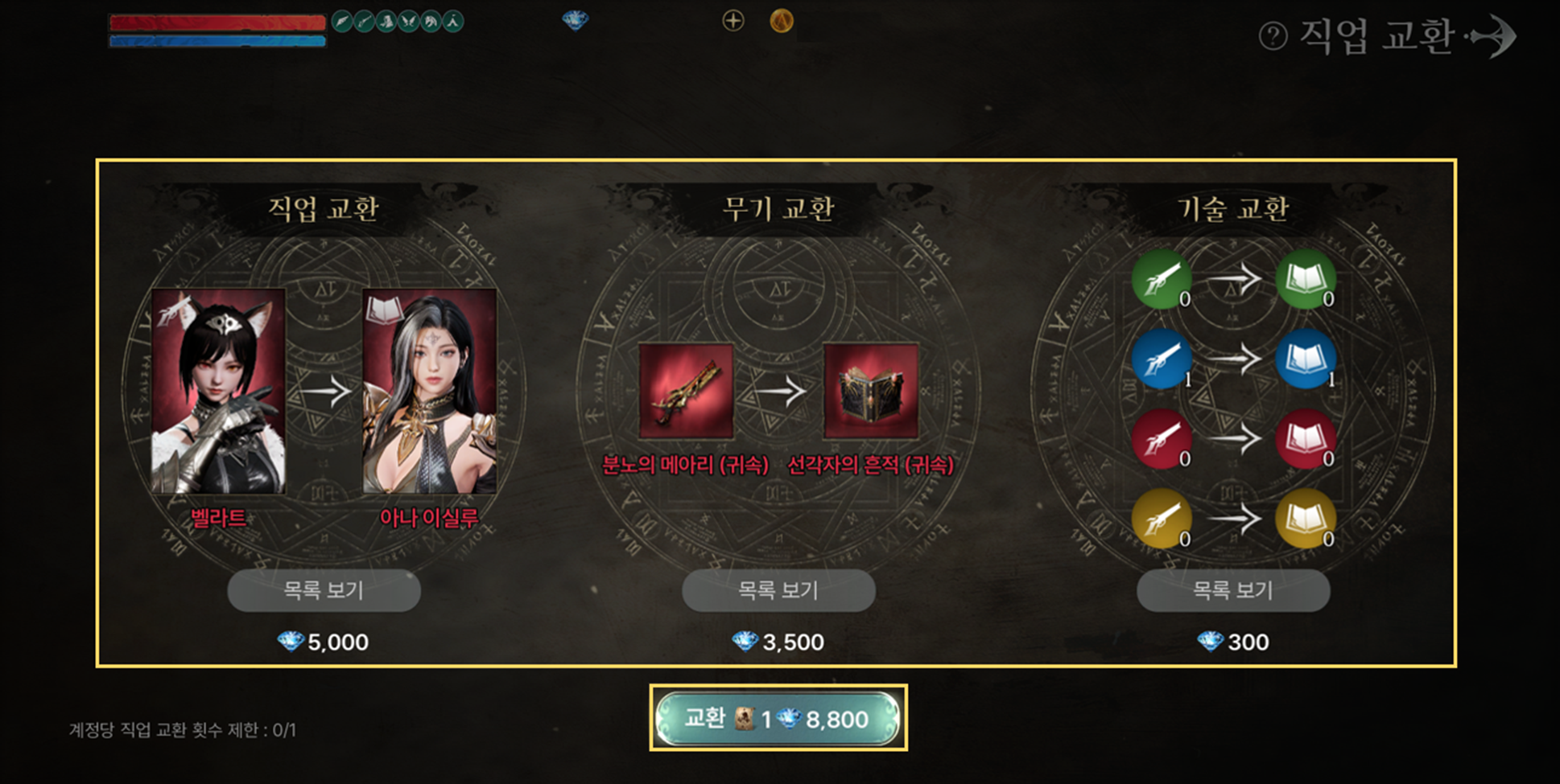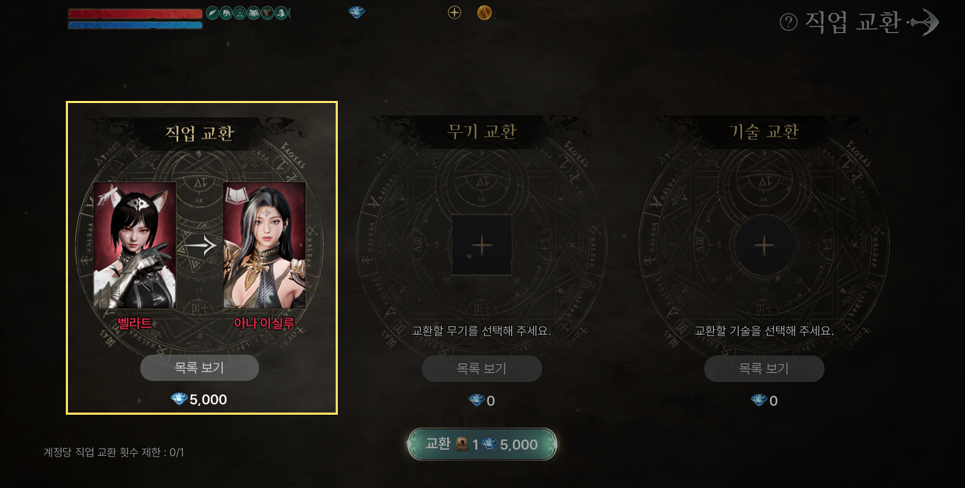 · 직업 교환은 [직업 선택 → 무기 선택 → 기술 선택] 순으로 진행되며, 선택한 직업, 무기, 기술이 일괄적으로 교환됩니다.