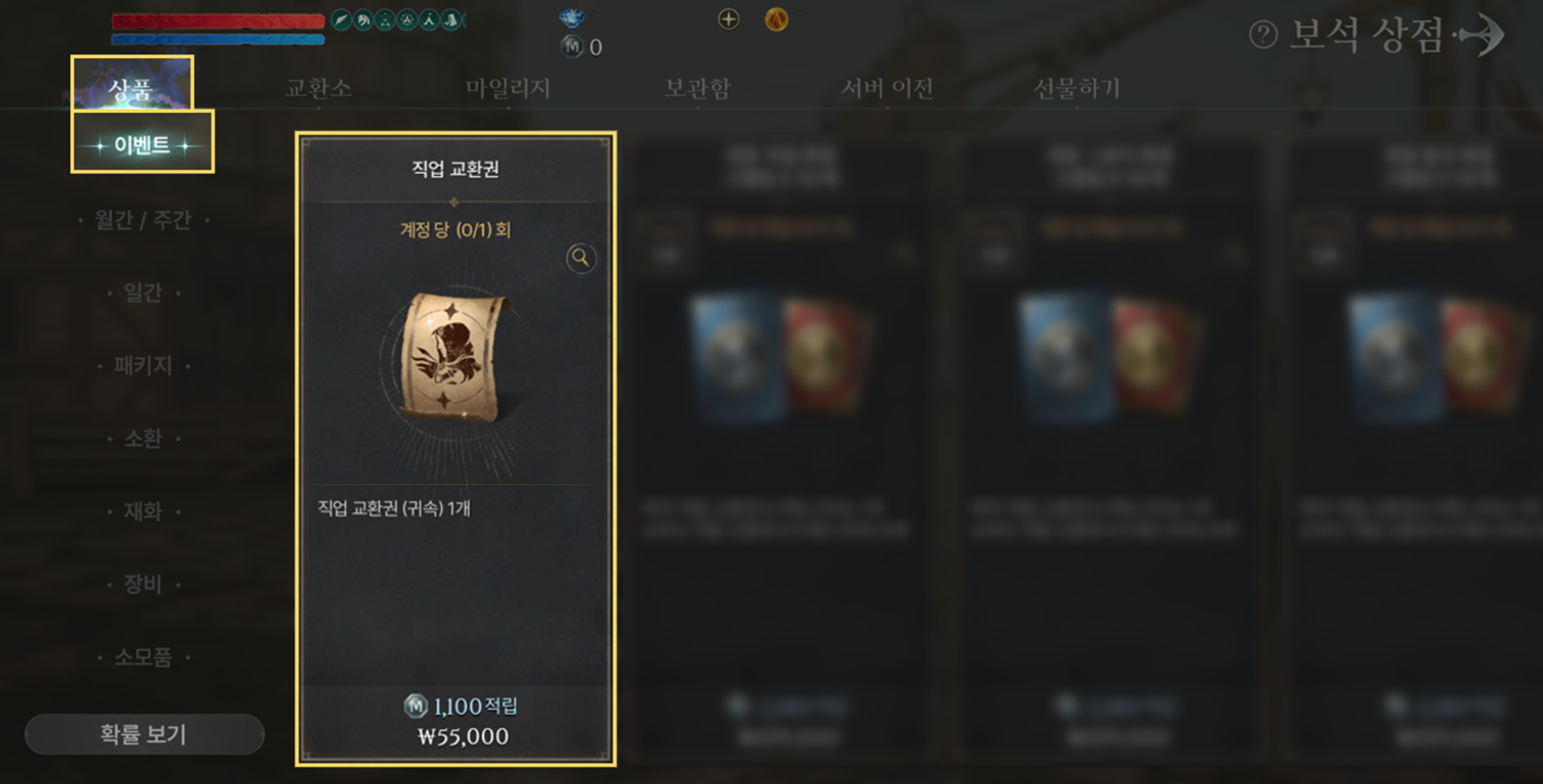 - 직업 교환권 (귀속) 상품은 계정당 1회만 구매할 수 있습니다.