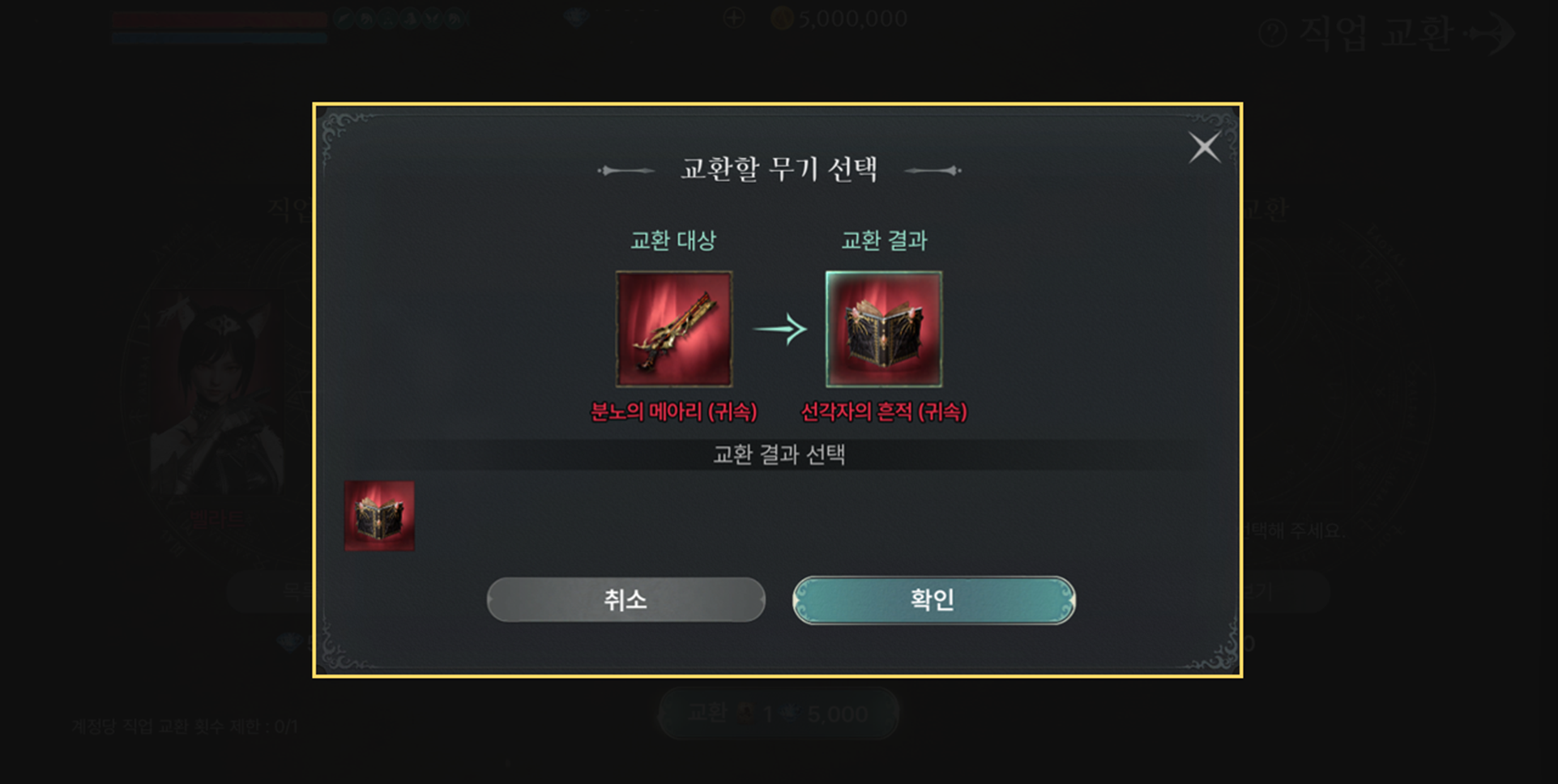 ⓘ 교환 대상 무기는 1개만 선택 가능하며, 교환 결과 무기는 마도서 무기만 선택 가능합니다.