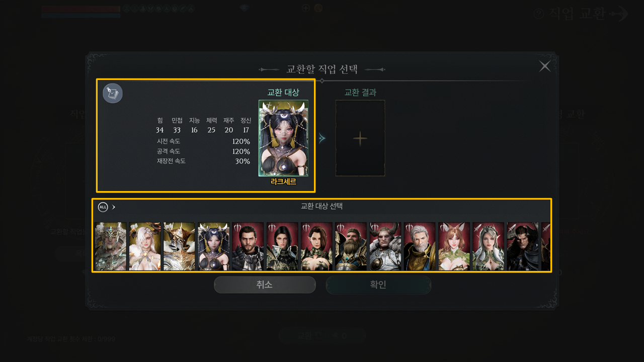 - 직업 교환 시 공격 속도 80%의 영웅 직업은 다른 직업군의 공격 속도 80% 직업 중 하나를 선택하여 교환할 수 있습니다.