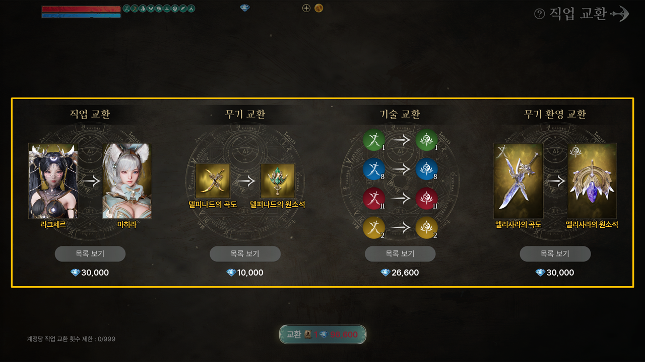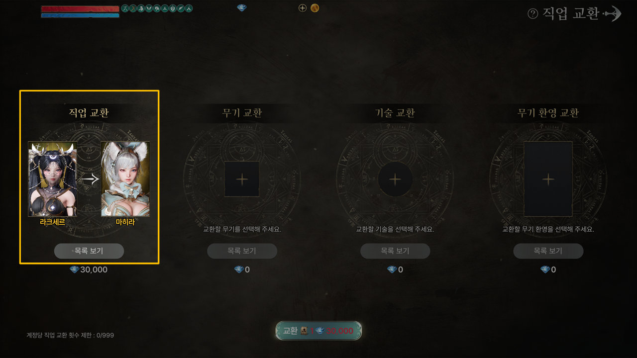 - 직업 교환은 계정 당 1회만 가능하고 직업을 선택하면 무기/기술/무기 환영을 선택하여 함께 교환할 수 있으며,