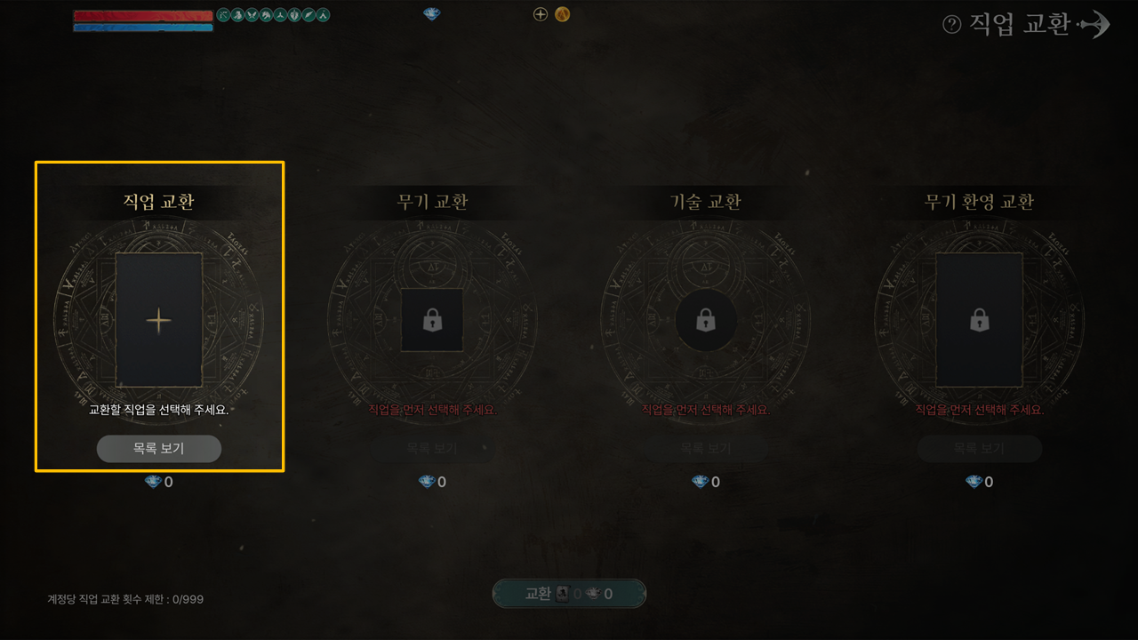 · 직업 교환은 [직업 선택 → 무기 선택 → 기술 선택 → 무기 환영 선택] 순으로 진행되며,