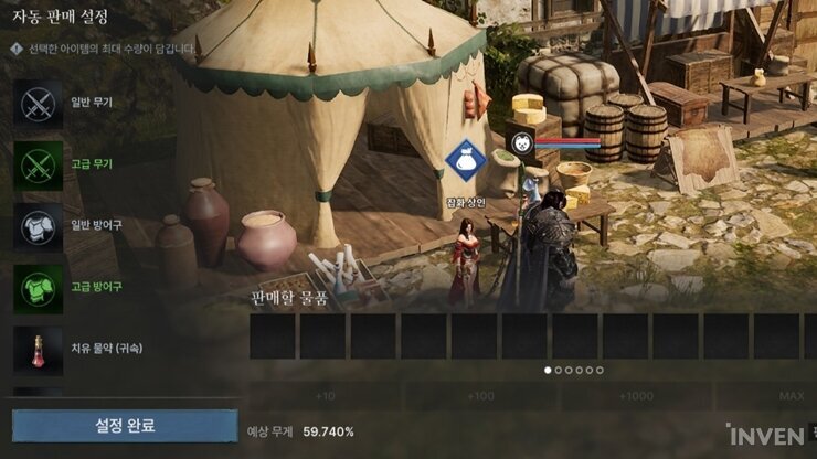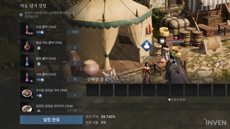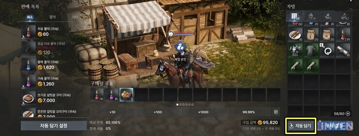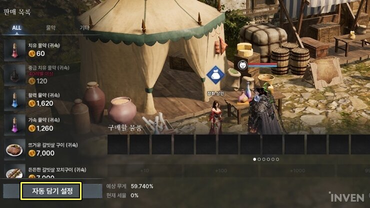 마을에 있는 상점에서 잡화 상인은 사냥에 필요한 물약, 음식, 주문서 등을 판매한다. 이러한 아이템들은 마을에 방문하면 수시로 보충해야 하므로 구매하려면 은근히 자주 손이 가게 된다. 그러나 시간을 조금 투자해 '자동 담기 설정'을 한다면 구매 과정을 간편하게 바꿀 수 있다.