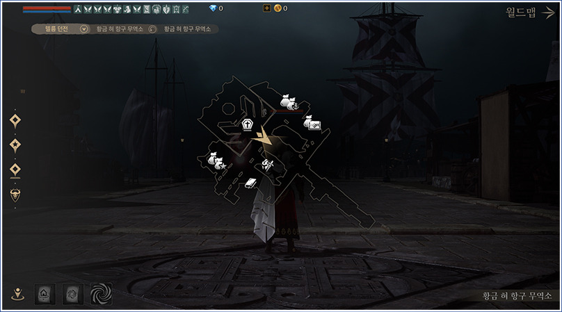 - 던전 로비 자동 매칭 버튼 좌측의 모닥불 아이콘 선택 시 황금 혀 항구 무역소에 입장할 수 있습니다.