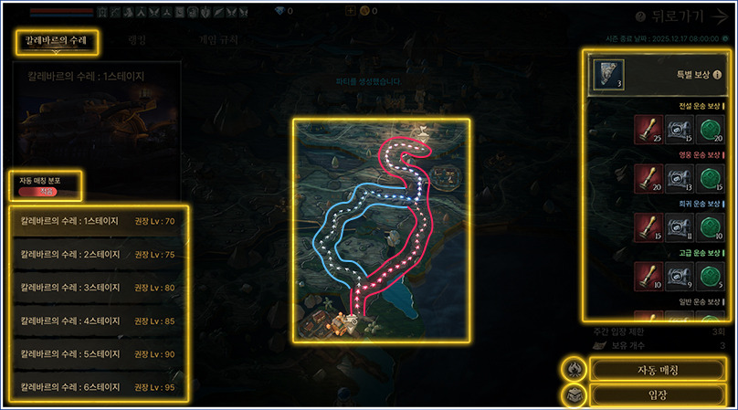 - 파티장이 칼레바르의 수레 던전 로비에서 도전할 스테이지 선택 후 자동 매칭 버튼을 누르면 매칭이 최대 30분간 진행됩니다.