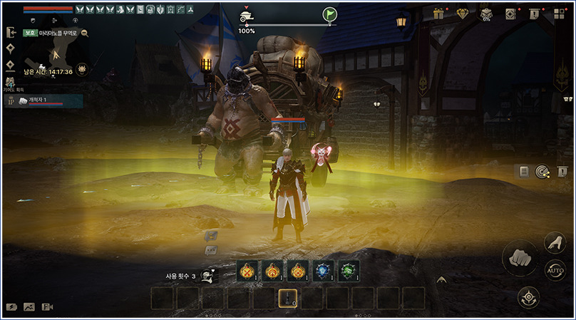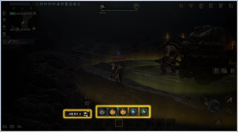 - 스테이지 시작 시 화면 중앙 하단에 칼레바르의 수레 전용 기술 슬롯 창이 출력되며, 아이콘을 눌러 아이템을 사용할 수 있습니다.
