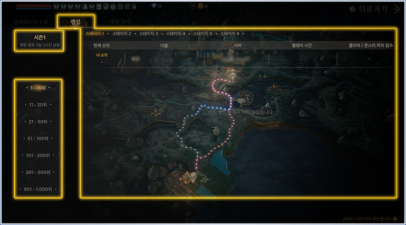 - 랭킹 화면에서는 현재 시즌에서 플레이어들이 달성한 스테이지 별 랭킹 순위를 확인할 수 있습니다.