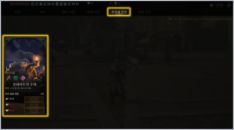 - 게임 내 [메뉴 - 던전 - 원정대 던전 - 칼레바르의 수레]를 차례로 선택하여 입장할 수 있습니다.