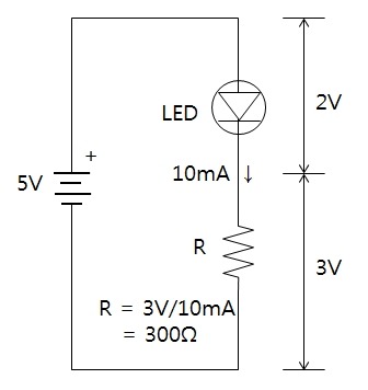 전체 전합은 5V인데 LED에서 2V가량 소모하므로 저항R에 걸리는 전압은 3V(= 5V - 2V) 이다.