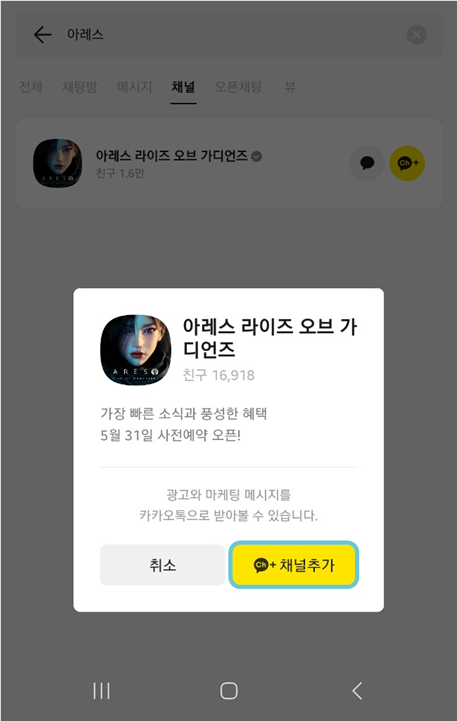 2) [채널] - [아레스 : 라이즈 오브 가디언즈] 검색 후 [채널 추가] 버튼 아이콘 터치