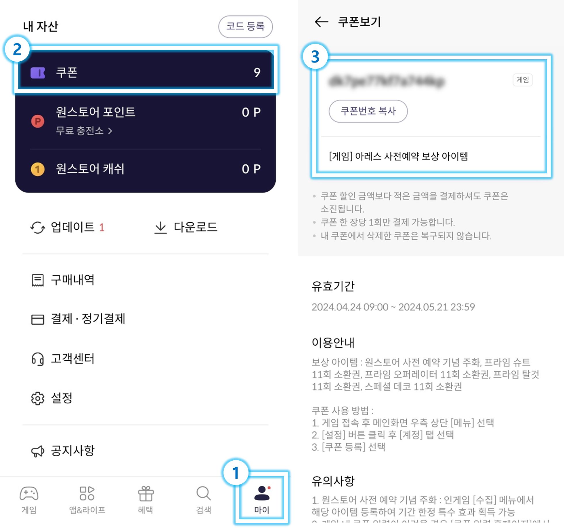 1. 원스토어 쿠폰함에 지급된 사전예약 쿠폰 번호 복사