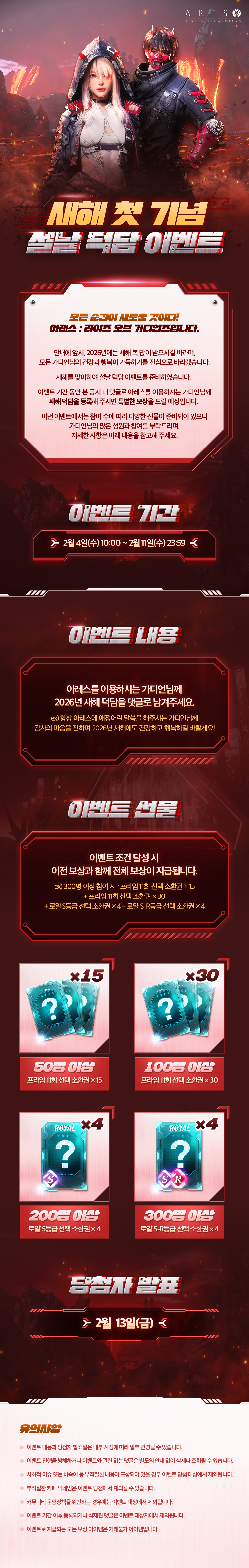1000일도 머지 않았네요 오픈때 부터 쭉 했는데 초반에는 소통도 잘하고해서 너무 좋았는데 요즘은 아쉬운 점이 많네요 점점 애증의 게임이 되어가는게 아쉽네요 이번 설날의 기점으로 소통도 하고 유저가 바라는 방향으로 같이 나아갈 수 있으면 좋겠습니다. 항상 수고 많으시고 새해복 많이 받으세요 설날 연휴는 푹쉬고 휴무 지나면 열심히 일해서 많은걸 보여주세요!!!!!