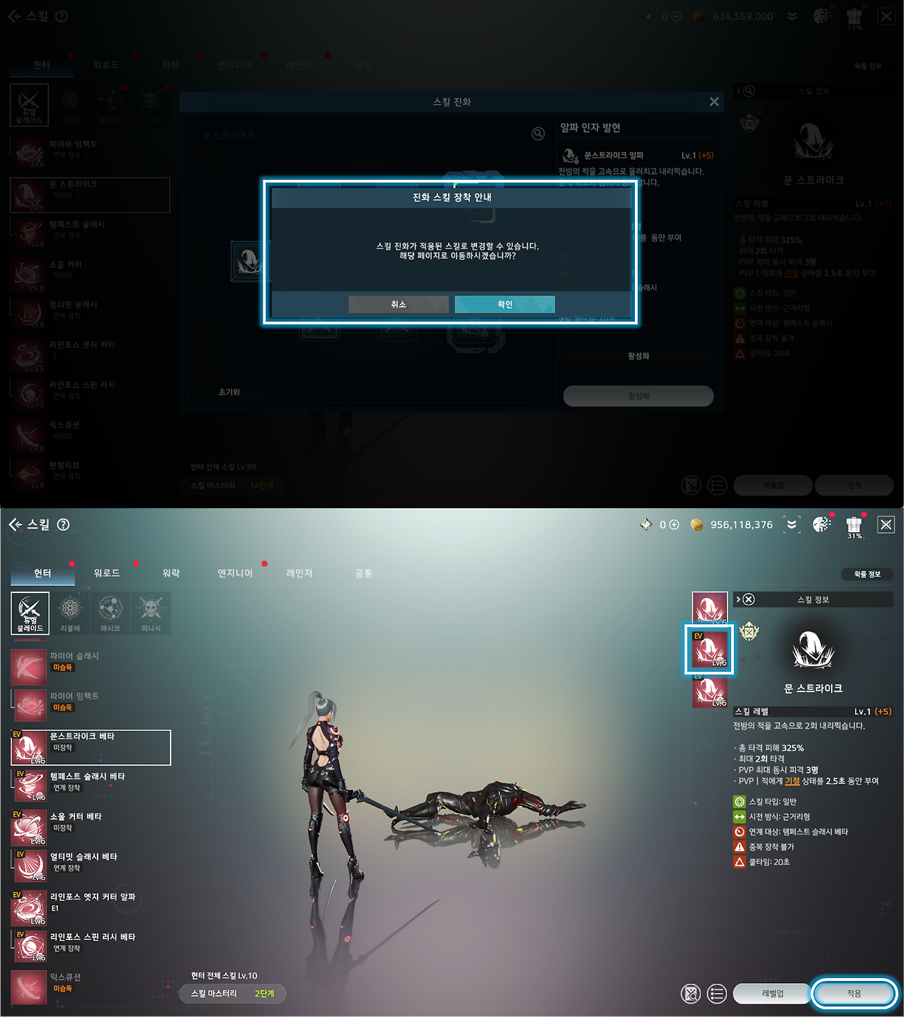 - 스킬 진화를 완료한 경우 '돋보기' ▶ 진화 완료 스킬 클릭 ▶ 적용'을 통해 장착할 수 있습니다.