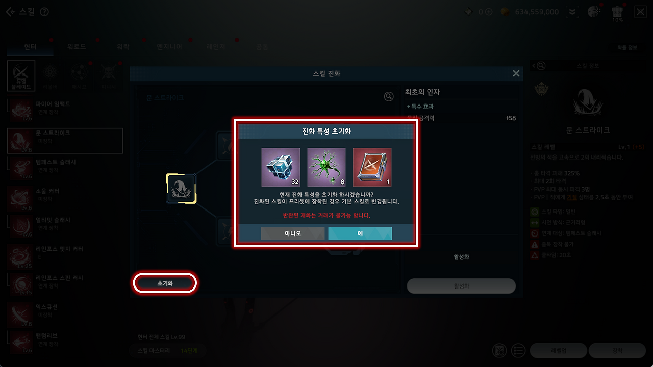 - 초기화 시 사용된 재화 및 스킬북은 거래가 불가로 반환되는 점 이용에 참고하여 주시기 바랍니다.