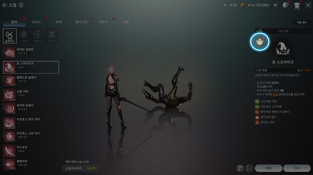 - 스킬 진화는 [메뉴 ▶ 스킬]에서 오른쪽 스킬 설명 부분에 아이콘을 클릭하여 진행할 수 있습니다.