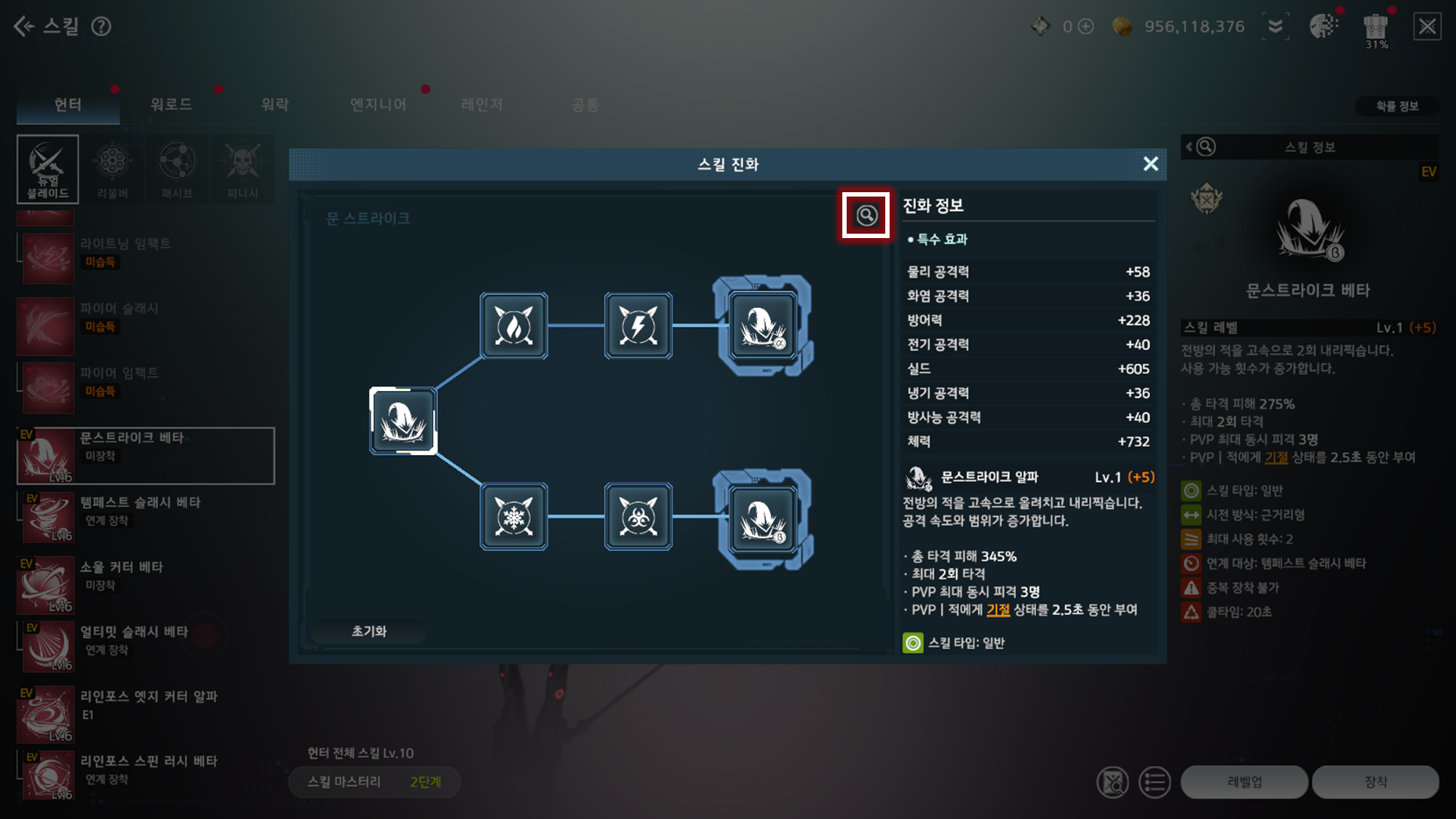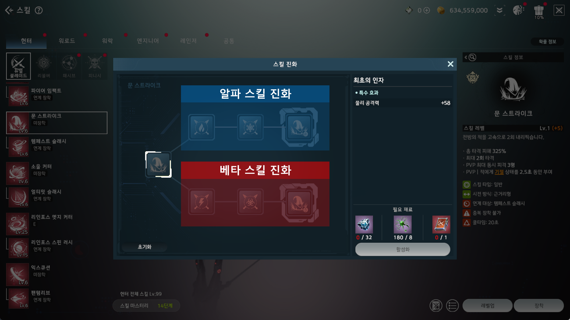 - 스킬 화면 내 '돋보기' 아이콘을 클릭하여 '알파, 베타'의 스킬 상세 정보를 확인할 수 있습니다.
