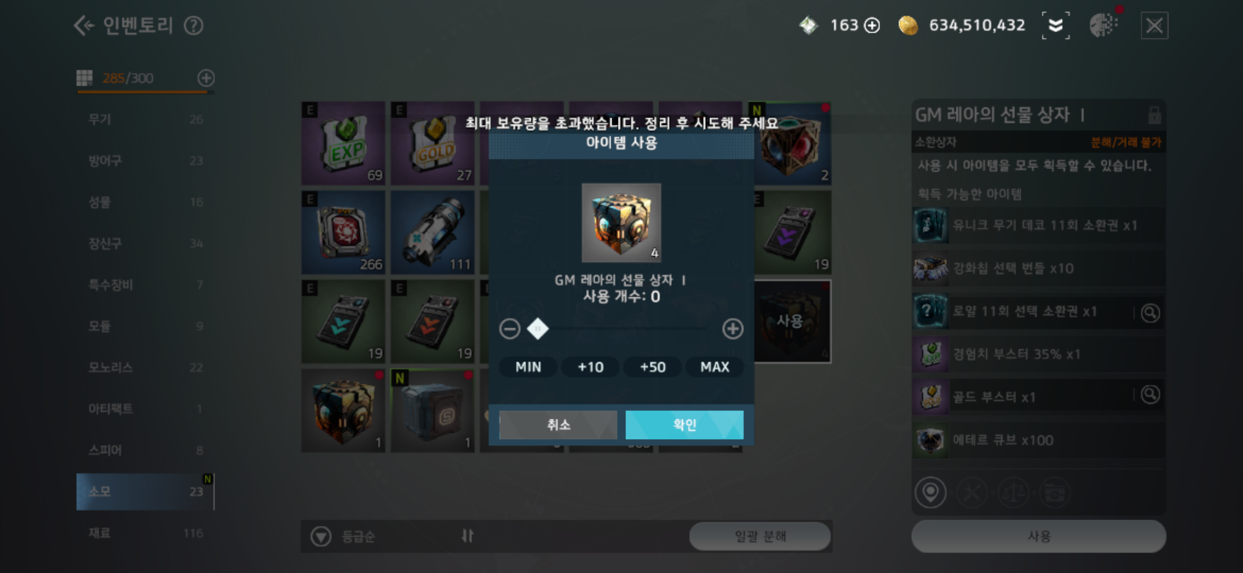 최대 보유량이 초과할 경우 해당 아이템이 사용이 불가능한 부분으로 확인됩니다.