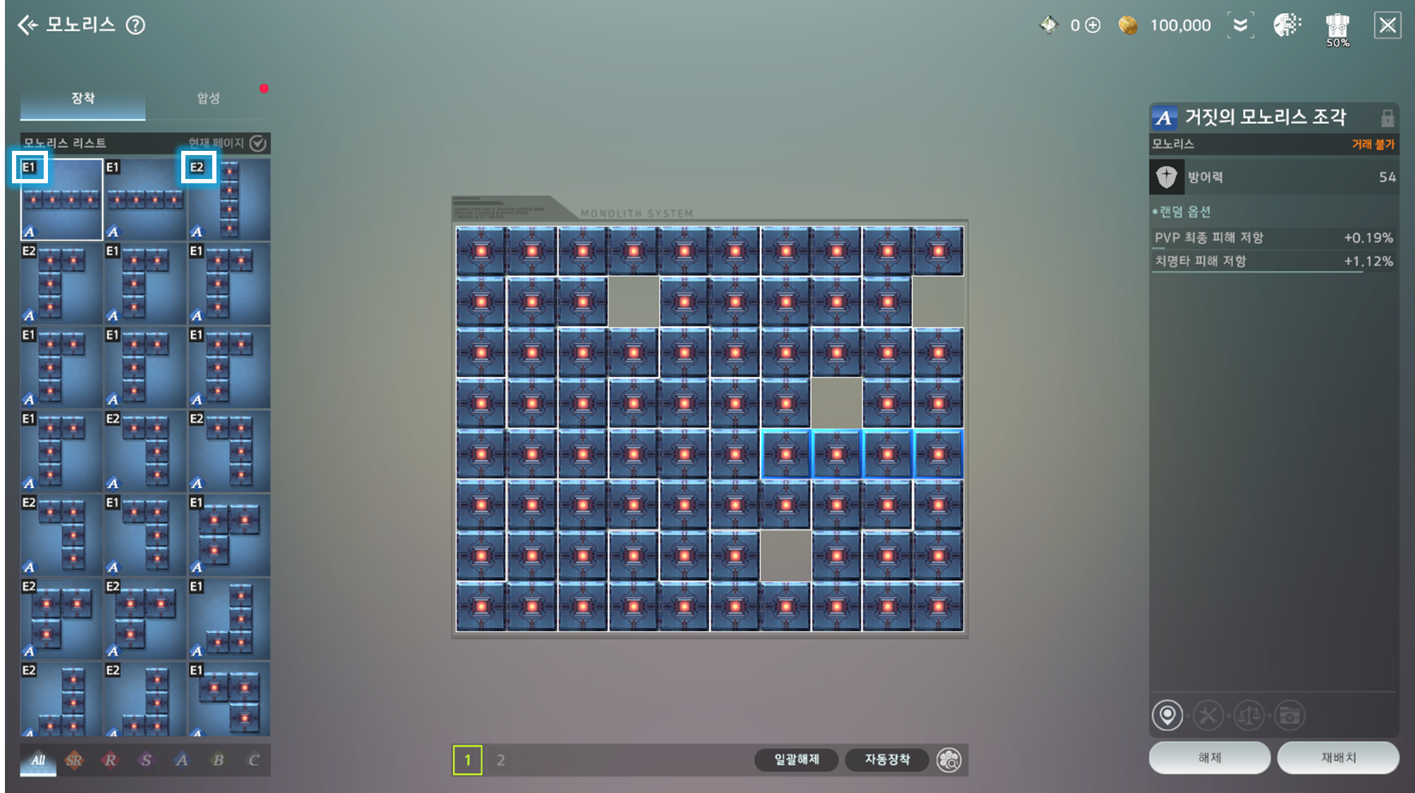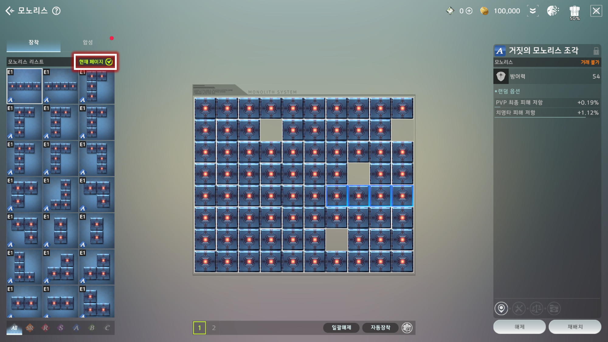 ⓘ '현재 페이지' 체크 시 현재 페이지에 장착된 모노리스 조각과 장착되지 않은 모노리스 조각 리스트를 확인할 수 있습니다.