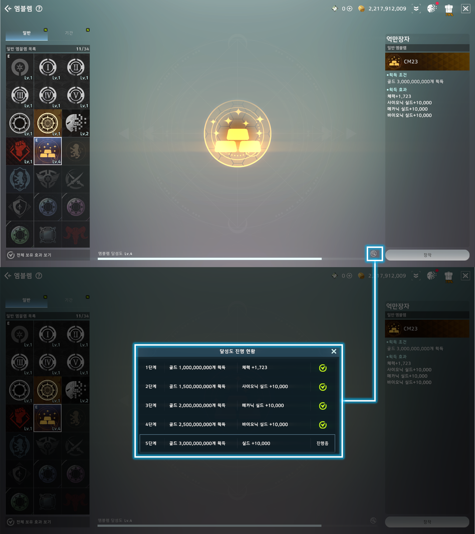 | Lv.3 | 골드 2,000,000,000개 획득 | 메카닉 실드 +10,000 | |