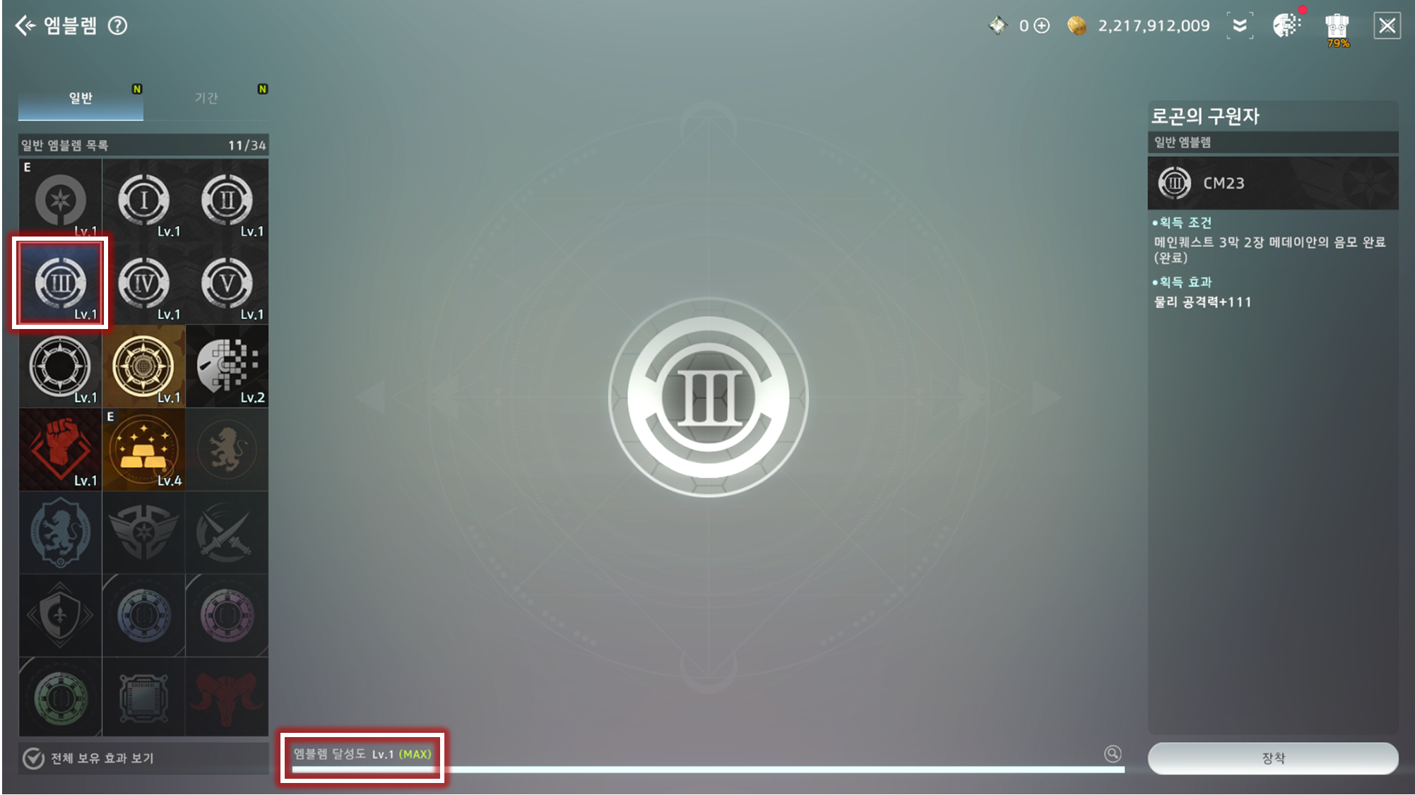 ⓘ 일부 엠블렘은 최대 레벨이 Lv.1로 더이상 레벨을 상승시킬 수 없습니다.