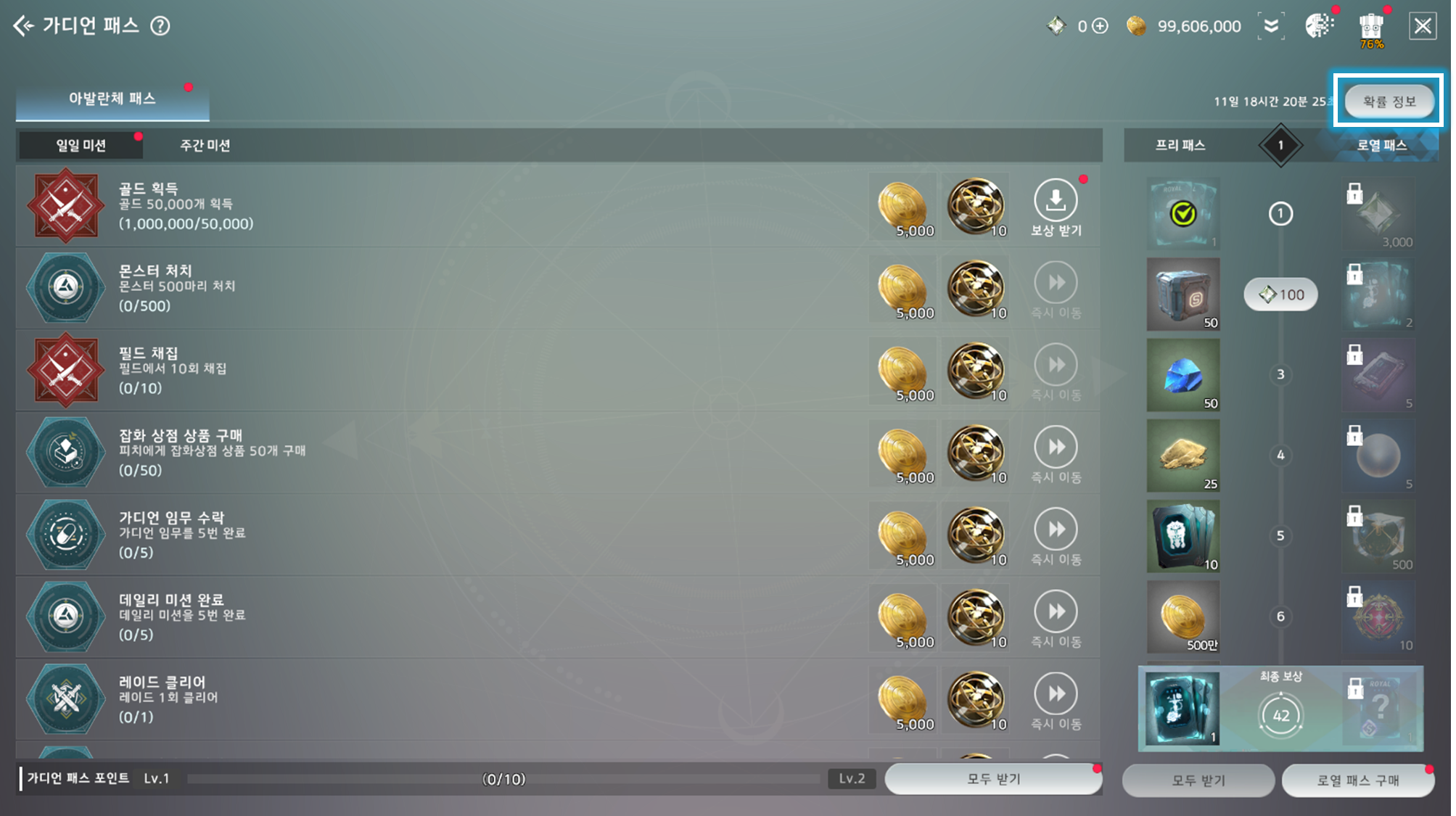 2. 미션 '모두 받기' 기능이 특정 상황에서 클릭하는 경우 게임이 멈추는 현상이 수정됩니다.