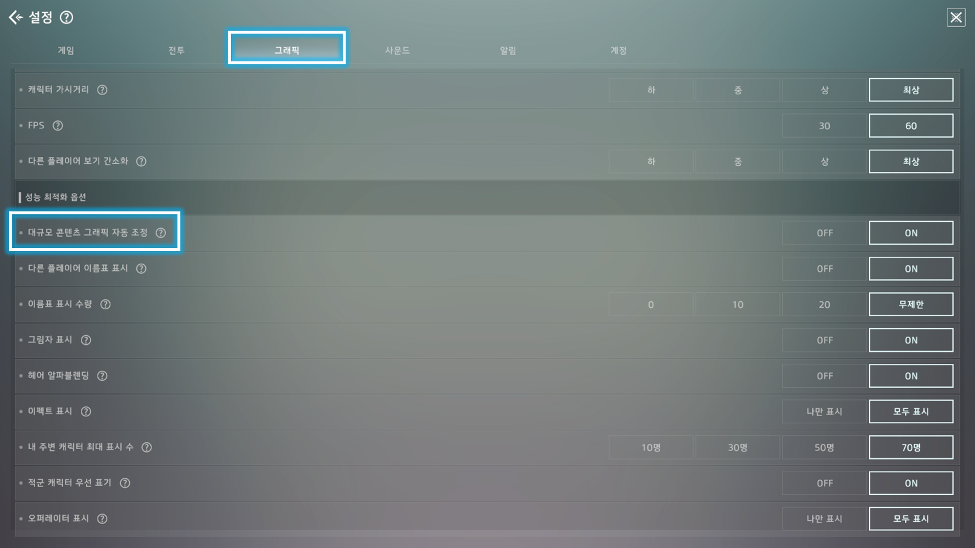 7. 설정 ▶ 그래픽 ▶ 대규모 콘텐츠 그래픽 자동 조정 ON/OFF 옵션이 추가됩니다.