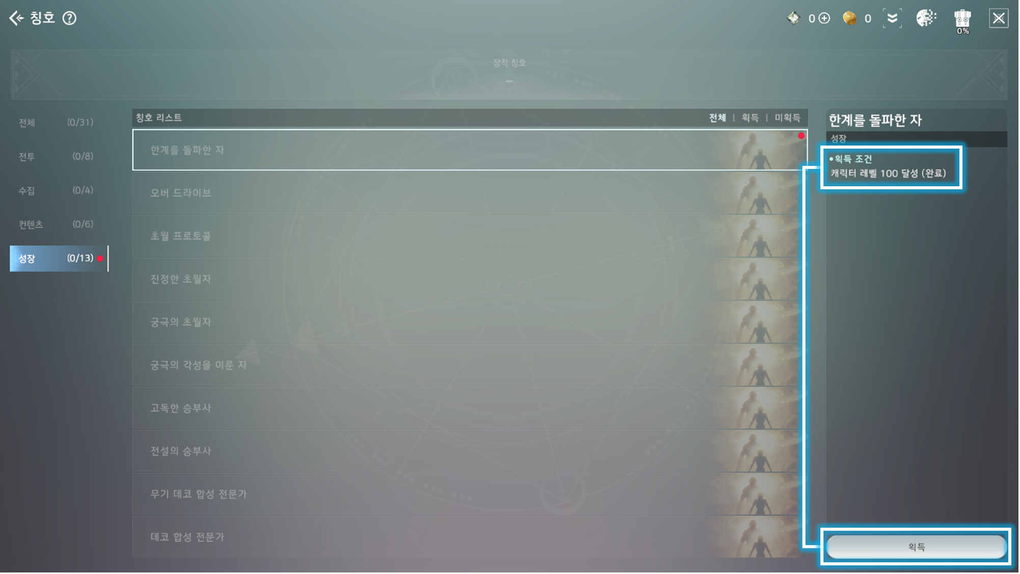 | Ex) 진정한 초월자 - 획득 조건 : 탈것 초월 5단계 달성 (업데이트 이전 탈것 초월 5단계 달성 시 자동 획득) |