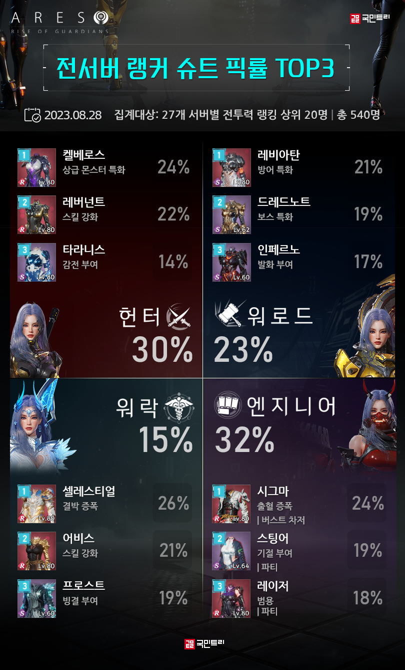 랭커들의 슈트 픽률에 약간의 변화가 있었습니다. 엔지니어가 헌터를 따돌리고 소폭 앞서나갔으며, 워로드의 수치가 1% 포인트 상승했죠. 전체적인 슈트 선택 기조는 태생 R등급으로 기울고 있습니다. 4종의 슈트가 모두 이러한 지표를 보이고 있죠. 특히 워락의 상승률이 높았습니다. 지난주 워락의 R등급 슈트 지분 합은 37%였으나, 금주 10% 포인트가 올라 47%를 돌파했죠. 엔지니어도 4위에 머물렀던 레이저가 3위에 이름을 올리며 태생 R등급 슈트 지분이 42%를 넘겼습니다.