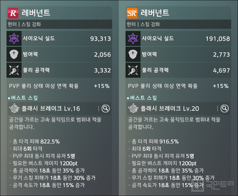 이 같은 순위 변화의 중심에는 슈트 승급이 있습니다. 일부 랭커 사이에서 태생 R등급 슈트를 SR로 승급하는 모습을 포착했죠. 1위 부에노 님은 ‘레버넌트’의 승급과 동시에 100레벨 육성을 끝내 전투력 상승에 가장 큰 지분을 차지한 것으로 추정됩니다. 해당 슈트의 R등급 80레벨을 기준으로 SR등급 100레벨의 능력치를 비교하면 물리 공격력 약 1.4배, 실드는 무려 2배가 넘는 차이를 보이죠. 기본 능력치 외에도 버스트와 슈트 스킬의 레벨 상한이 4레벨 확장돼 더욱 강력한 대미지를 가할 수 있는 것도 메리트입니다.