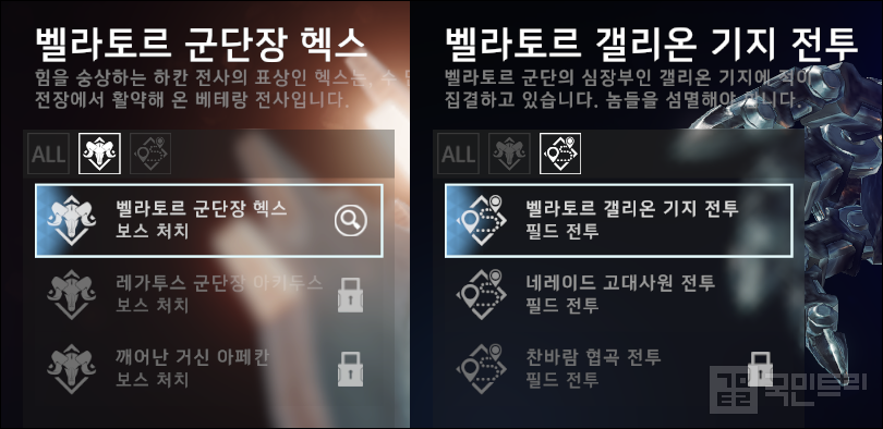 이번 주 유저 투표 주제는 행성 파견의 선호도 조사입니다. 행성 파견은 앞서 레이드와 반대로 혼자서 공략하는 콘텐츠이고, 무기 강화 재료나 슈트 스킬 칩 등을 얻을 수 있죠. 크게 ‘보스 처치’와 ‘필드 전투’의 두 가지로 나뉩니다. 그럼 가디언 여러분이 선호하는 행성 파견은 어떤 건가요? 많은 투표를 바라며, 결과는 다음 주 메카 랭킹 시간에 공개하겠습니다.