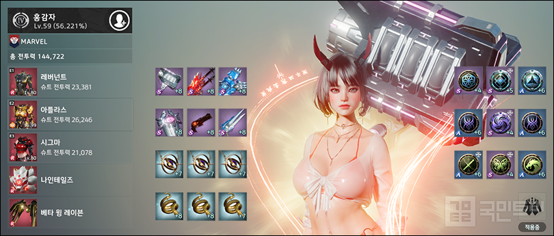 전체 전투력 2위 탈환에 성공한 트리톤5 홍감자 님의 세팅 분석입니다. 역시 가장 눈에 띄는 건 아틀라스의 SR승급이군요. 99레벨까지 육성을 마쳤으며, 슈트 전투력 2만 6천을 넘겨 세팅한 슈트 중 가장 독보적인 능력치를 기록했습니다. 속성 공격력이 더해진 S등급 제작 무기를 모든 부위에 채택했고, 강화도는 8강화로 통일했네요. 랜덤 옵션은 ‘물리 공격력’과 ‘치명타 확률’을 중심으로 세팅했습니다.