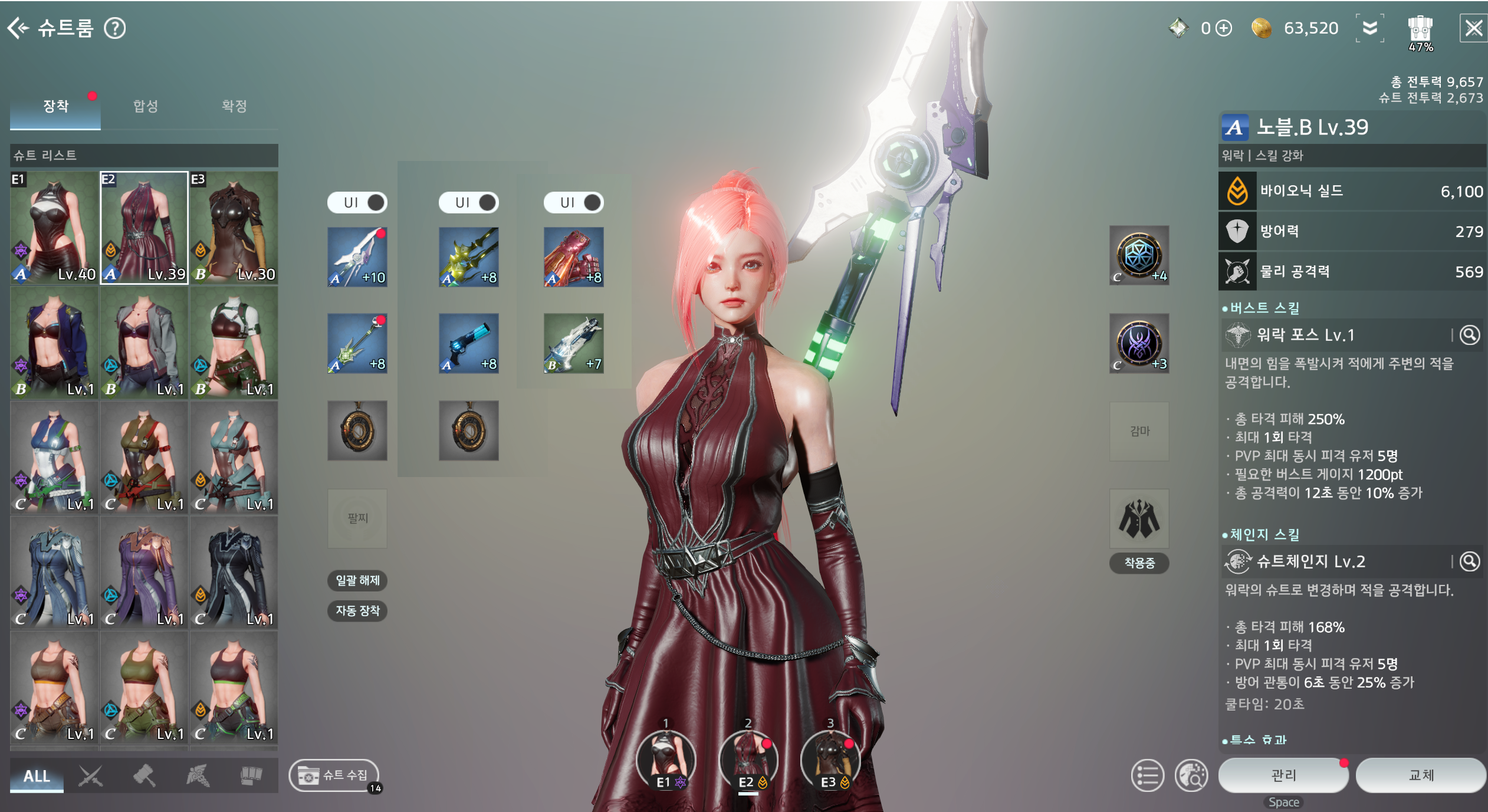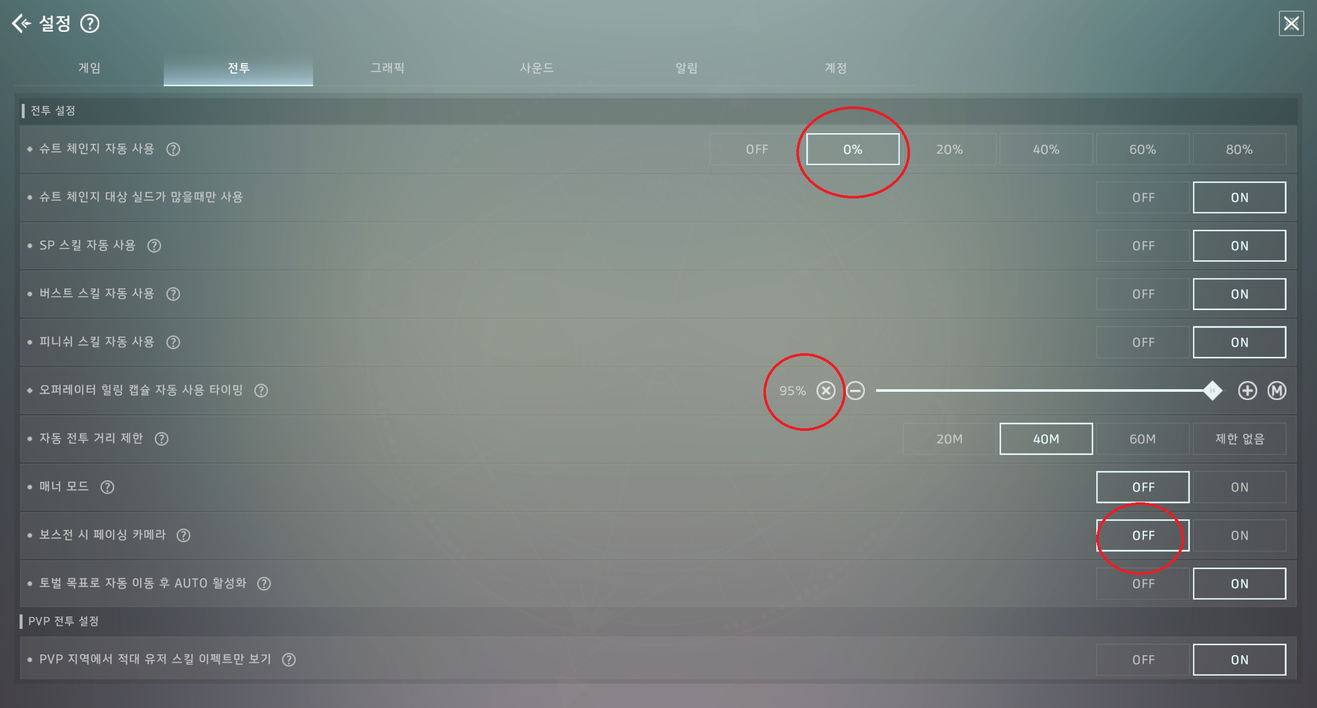 슈트 체인지를 위해 필자는 슈트체인지 자동사용을 0% ~ 20%로 두는 편이고,