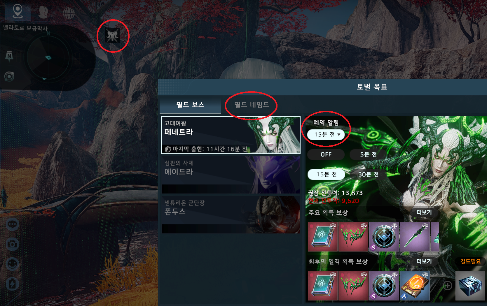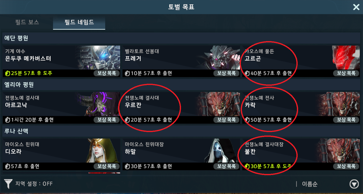 필드보스와 필드 네임드를 체크하였고,
