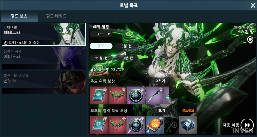 또는 미니맵 우측의 아이콘을 클릭해도 토벌 목표 확인이 가능하다. 여기서는 필드 보스와 필드 네임드를 따로 볼 수 있다. 필드 보스는 예약 알림을 사용해 5분~30분 전에 알림을 받을 수도 있다. 필드 네임드 탭은 모든 지역의 필드 네임드를 보여주며 좌측 하단의 지역 설정을 통해 보고 싶은 지역만 정렬해도 무방하다.