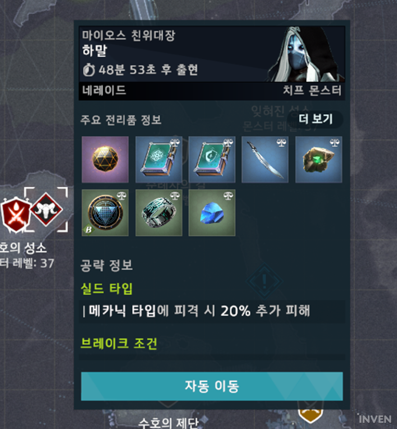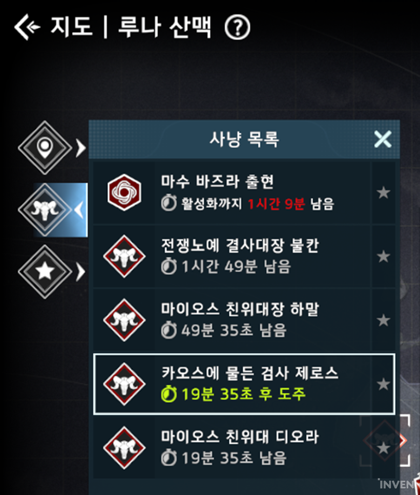 맵에 있는 사냥 아이콘을 클릭해 보면 스폰 시간과 주요 전리품 정보가 나오며 몬스터 도감과 마찬가지로 약점 타입, 몬스터 특성 등이 나온다. 좌측의 사냥 목록 아이콘을 누르면 해당 지역에서 등장하는 모든 필드 네임드와 필드 보스의 목록을 확인할 수 있다.