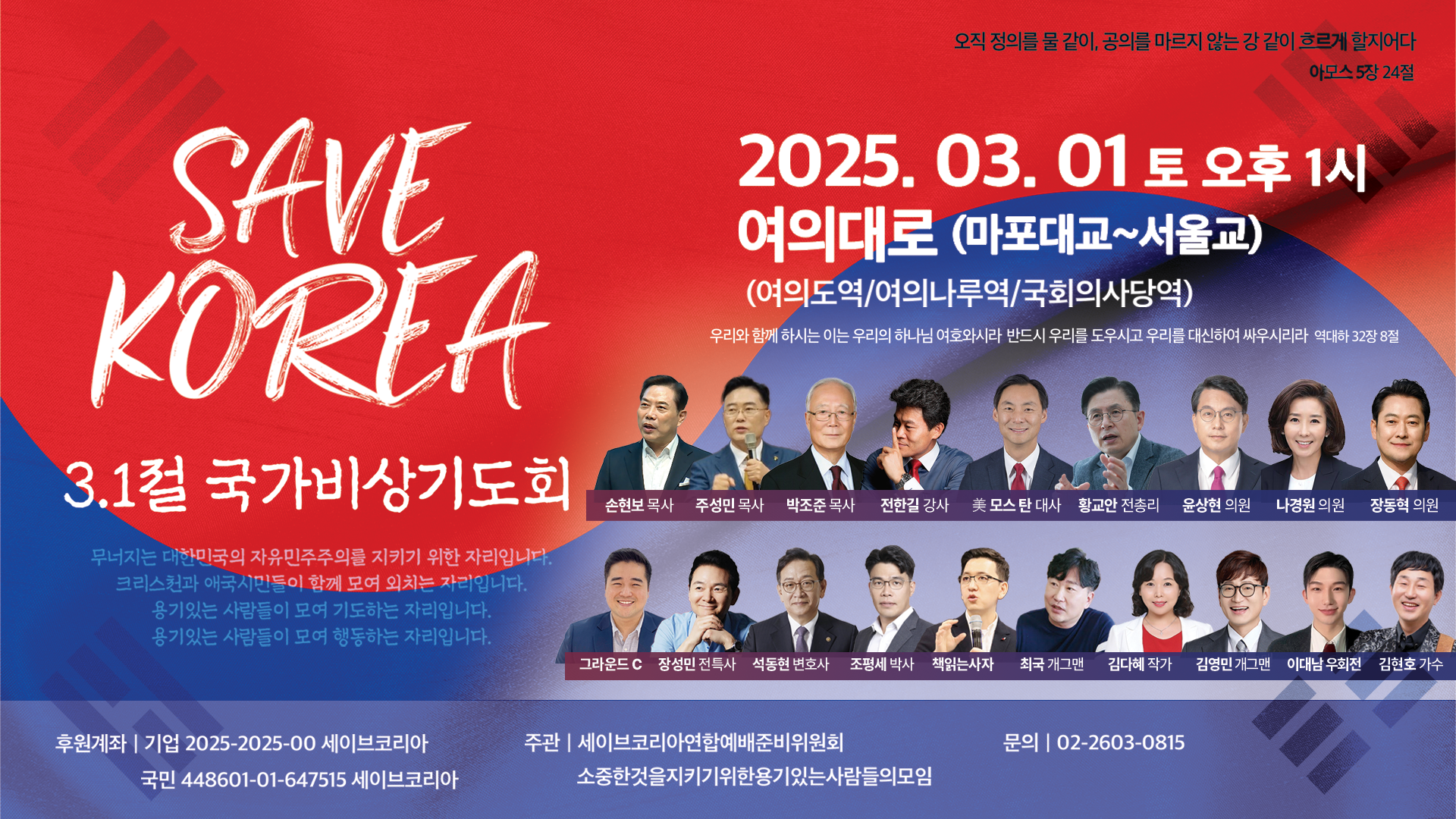 3.1절을 맞아 세이브코리아가 3월 1일 오후 1시부터 서울 여의도 국회 인근 여의대로에서 진행되는 ‘3.1절 국가비상기도회’에서는 집회 후 국회의사당 앞까지 행진이 진행된다.