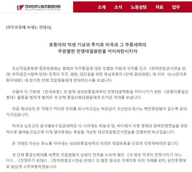 “반미 투쟁 힘있게 하자” 北이 보낸 ‘련대사’ 홈피에 올린 민노총