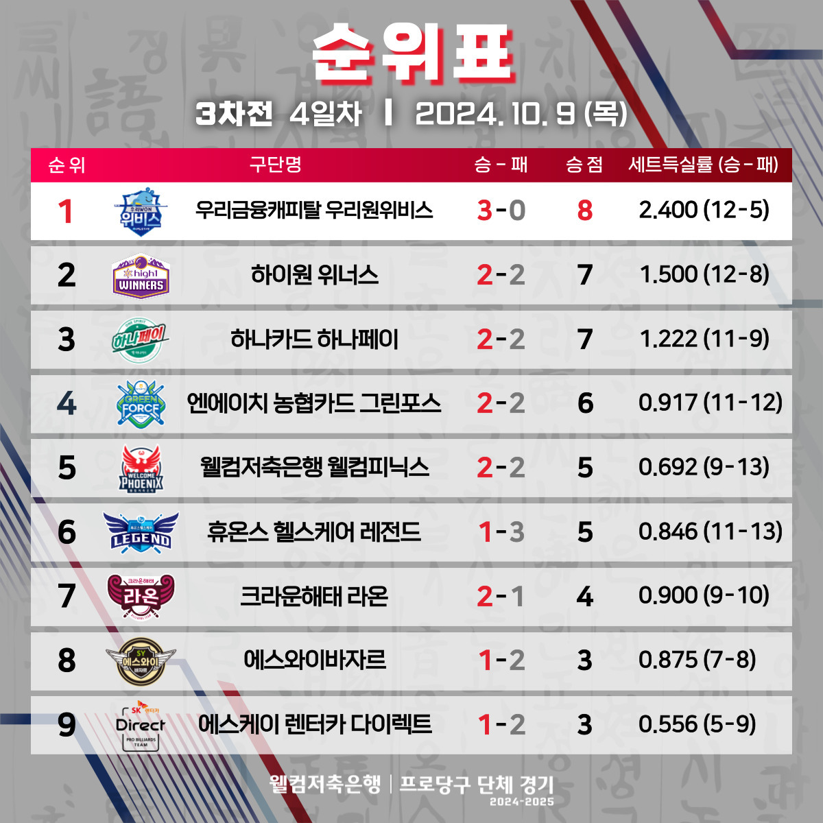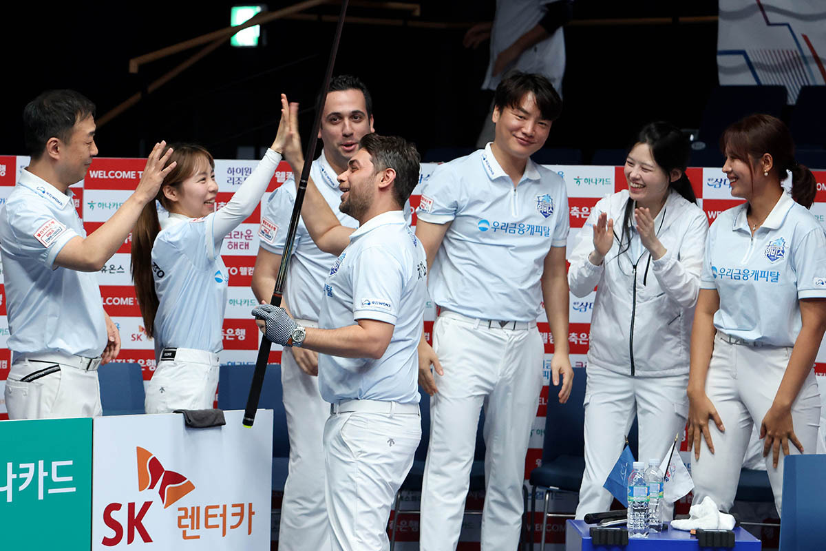 9일 경기도 고양시 ‘고양 킨텍스 PBA 스타디움’에서 열린 ‘웰컴저축은행 PBA 팀리그 2024-2025’ 3라운드 4일차 경기에서 우리금융캐피탈이 풀세트 접전 끝에 하이원리조트에 세트스코어 4-3으로 승리했다.