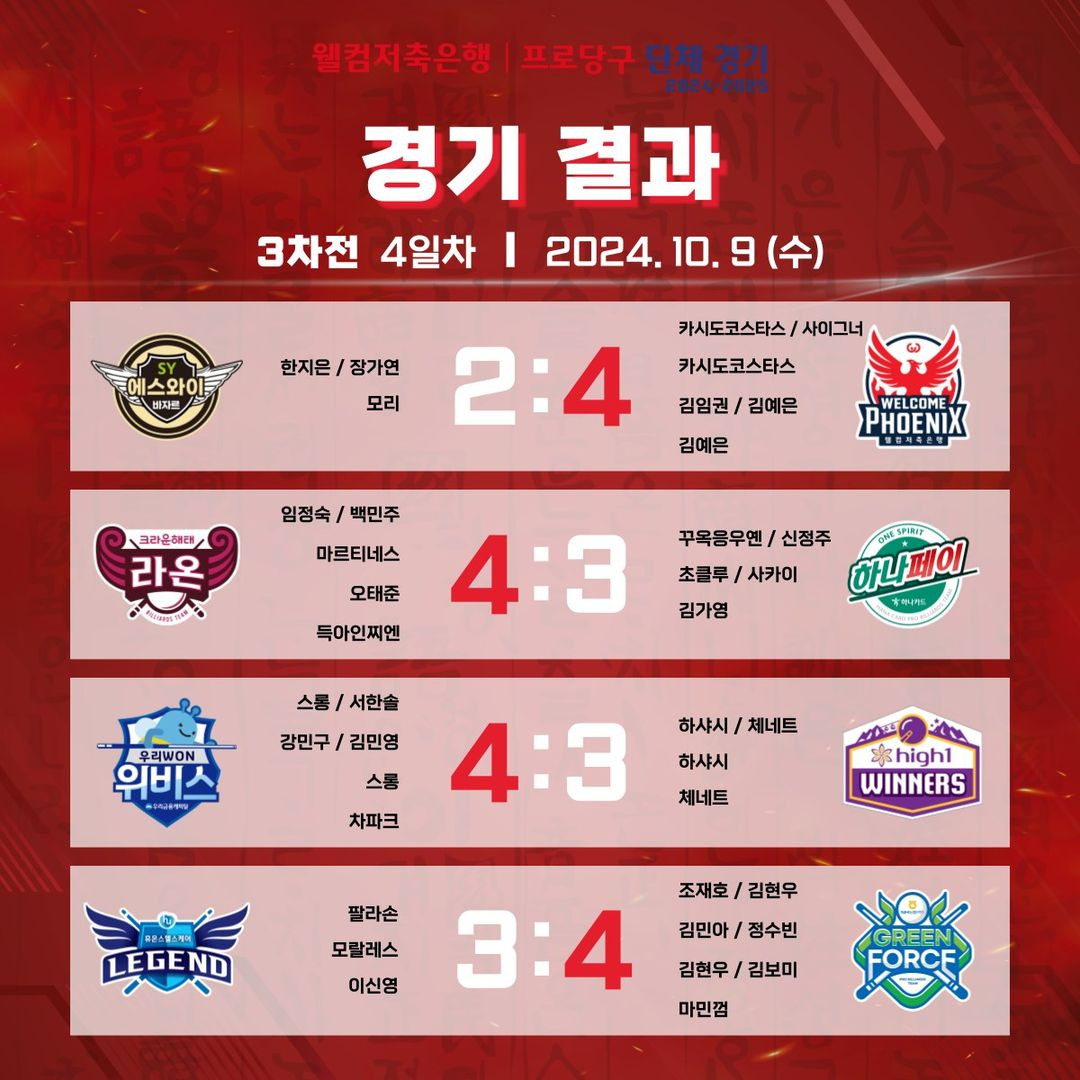 팀리그 3라운드 5일차인 10일에는 SK렌터카-하나카드(12:30) 경기를 시작으로 에스와이-하이원리조트(15:30), 크라운해태-NH농협카드(18:30), 우리금융캐피탈-휴온스(21:30) 경기가 이어진다. 웰컴저축은행은 휴식일을 가진다.