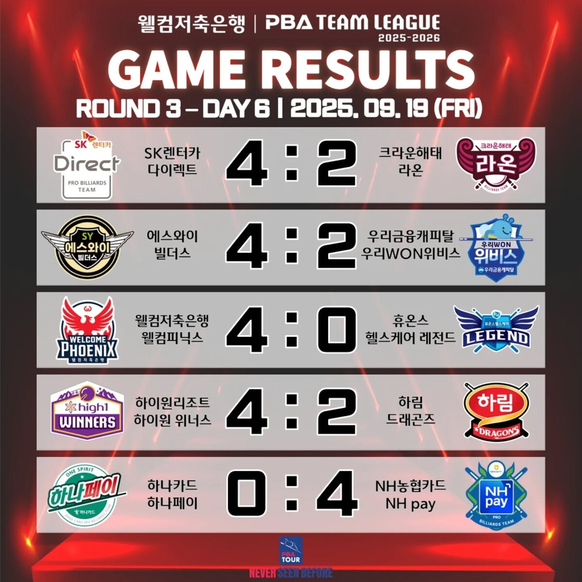 19일 낮 12시 30분에 경기도 고양시의 '고양 킨텍스 PBA 스타디움'에서 열린 '웰컴저축은행 PBA 팀리그 2025-2026' 3라운드 6일 차 경기에서 SK렌터카가 세트스코어 4-2로 크라운해태를 제압했다.