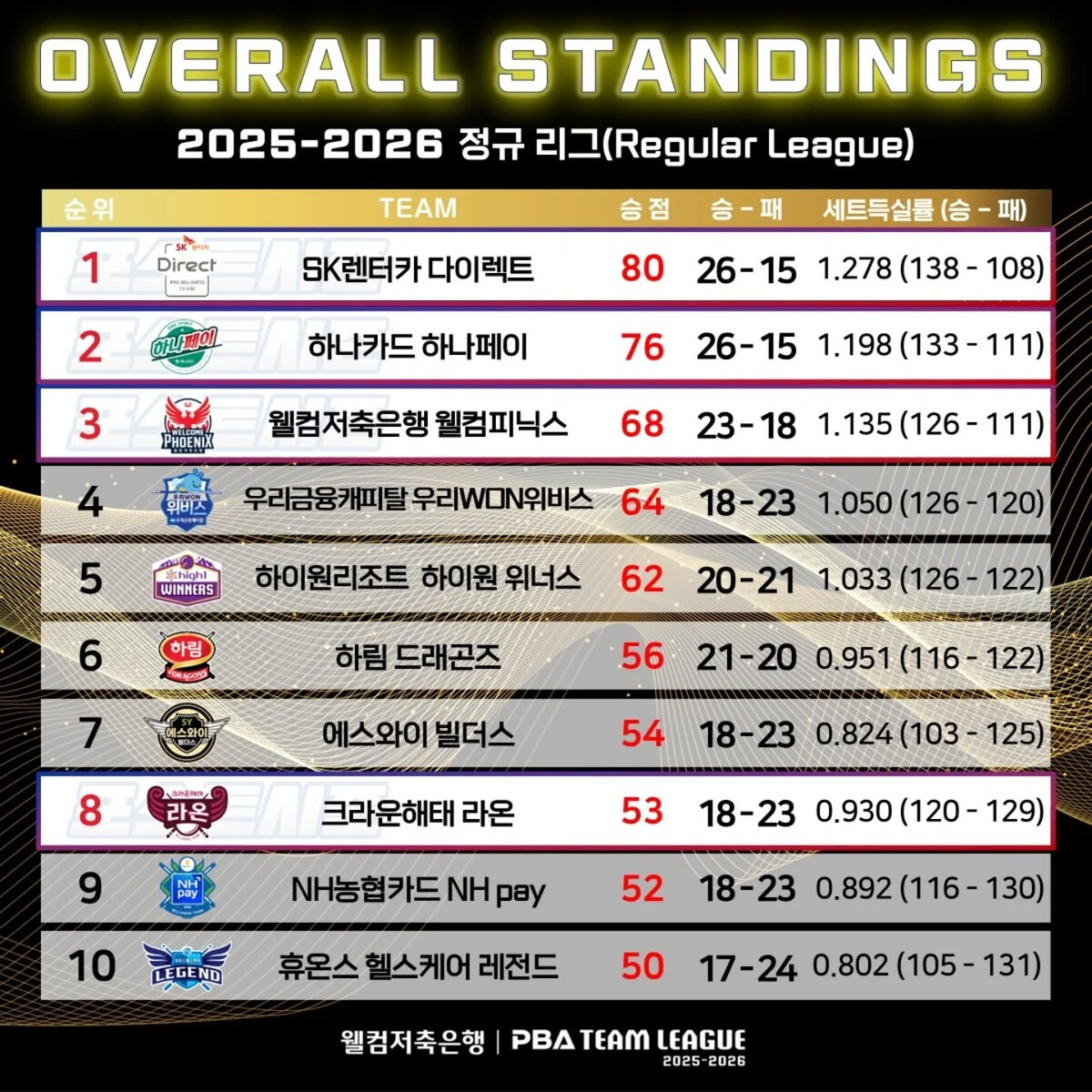 NH농협카드는 2승 3패(승점6)로 6위에 올라서며 최하위를 탈출했고, 웰컴저축은행은 2승 3패(승점6)로 전날 6위에서 8위로 내려갔다.